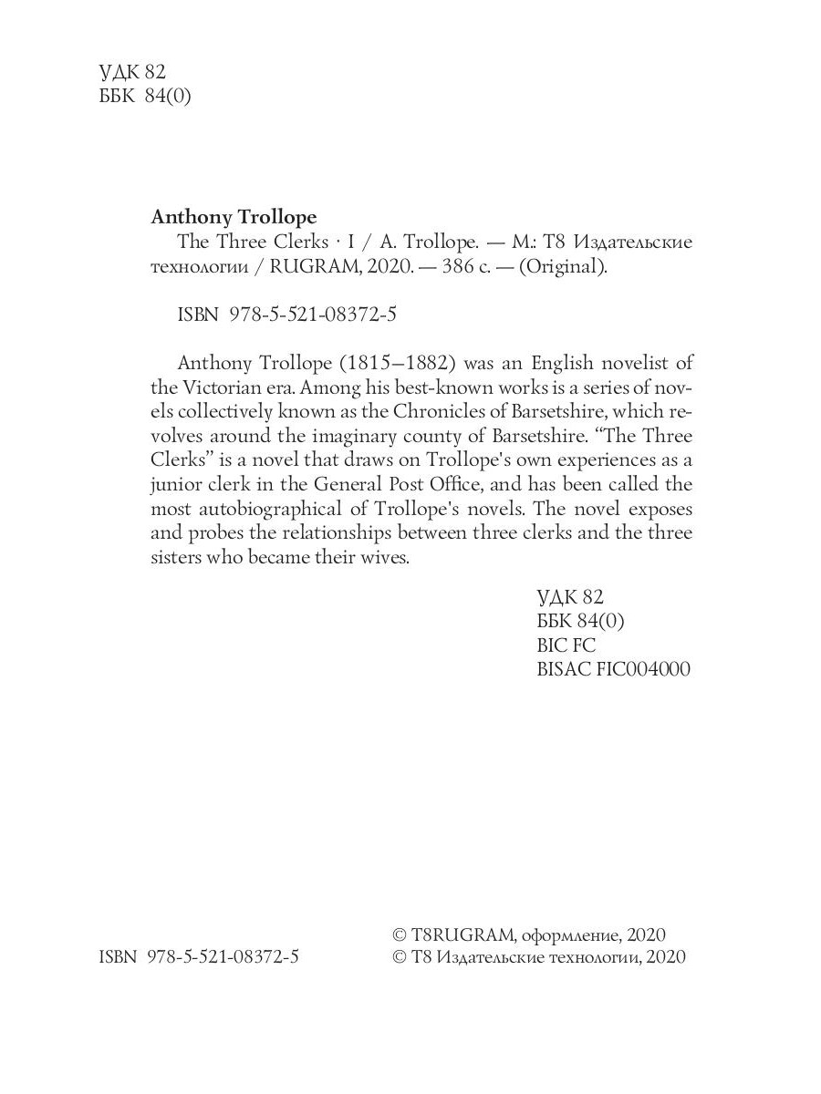Anthony Trollope (1815-1882) was an English novelist of the Victorian era. Among his best-known works is a series of novels collectively known as the Chronicles of Barsetshire, which revolves around the imaginary county of Barsetshire. "The Three Clerks" is a novel that draws on Trollope's own experiences as a junior clerk in the General Post Office, and has been called the most autobiographical of Trollope's novels. The novel exposes and probes the relationships between three clerks and the three sisters who became their wives.| Издательство | Т8 RUGRAM |