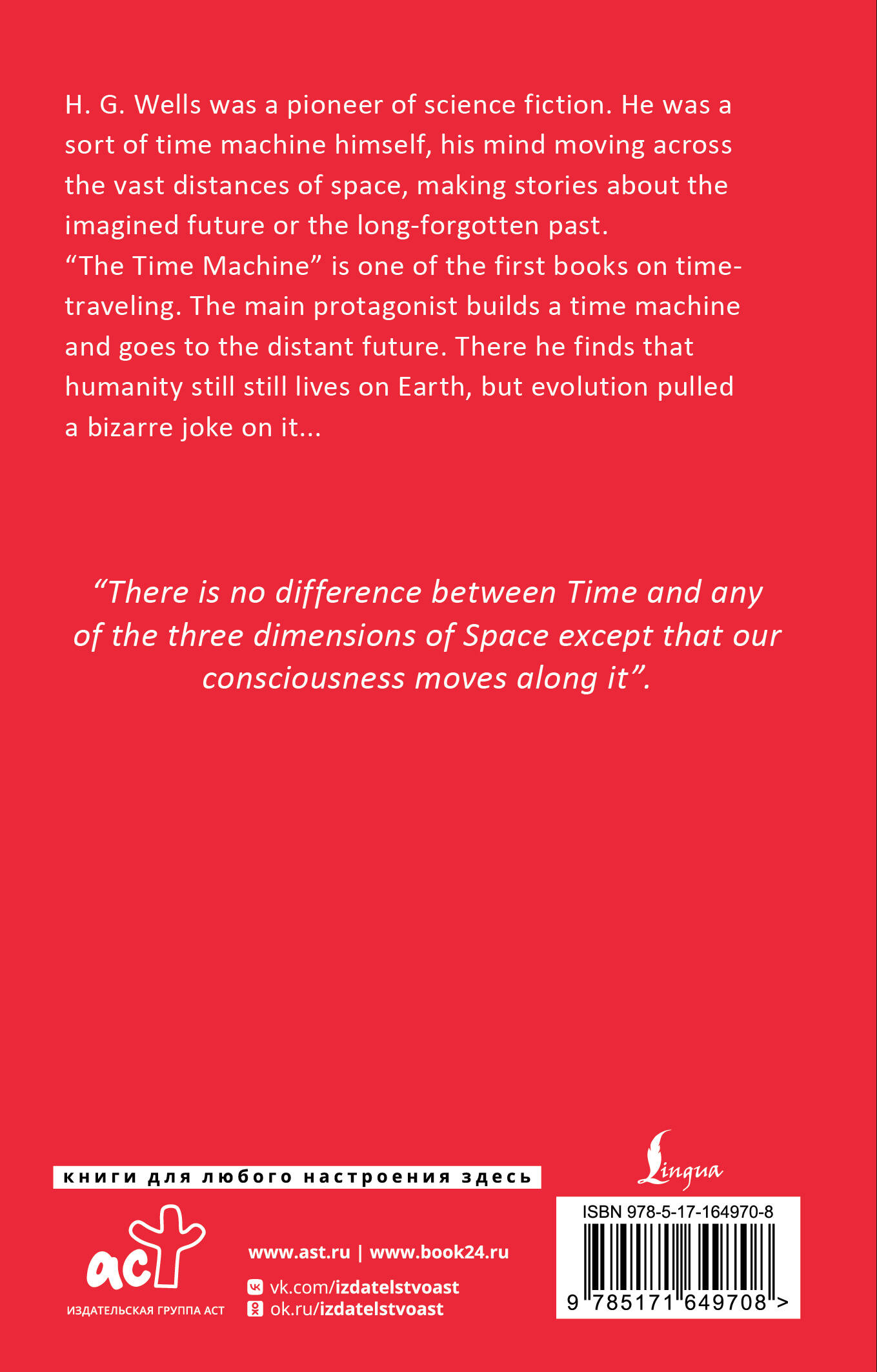 Не хватает времени подтянуть английский? Вам поможет "The Time Machine"! Герберт Дж. Уэллс был пионером научной фантастики. Он одним из первых создал книгу, сюжет которой развивается вокруг машины времени -- механизма, способного перемещать своего владельца между эпозами. Из викторианской Англии главный герой попадает на Землю будущего, всё ещё населенную людьми. Вот только люди эти уже здорово изменились... Книга издана без сокращений и адаптации. Наслаждайтесь новаторским гением Герберта Уэллса в оригинале!| Издательство | Издательство "АСТ" |