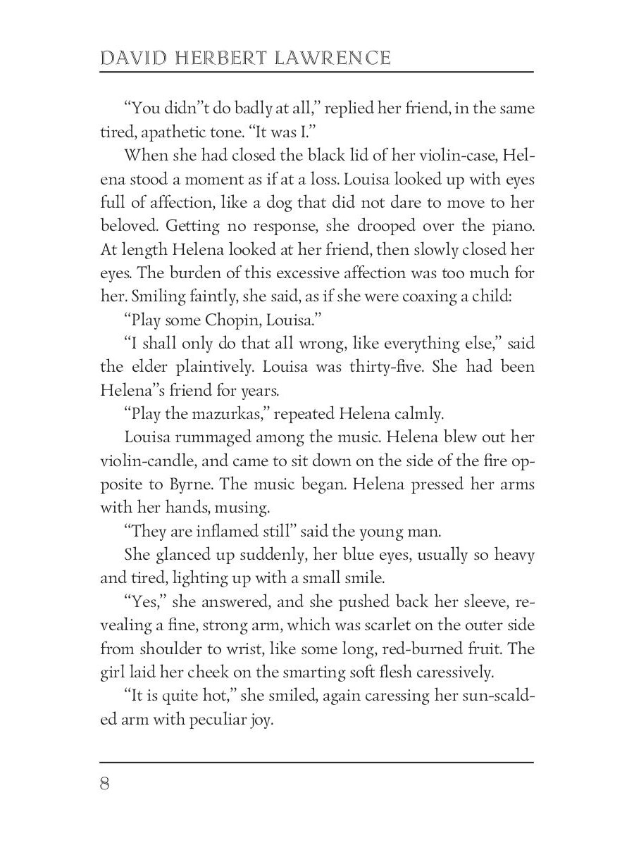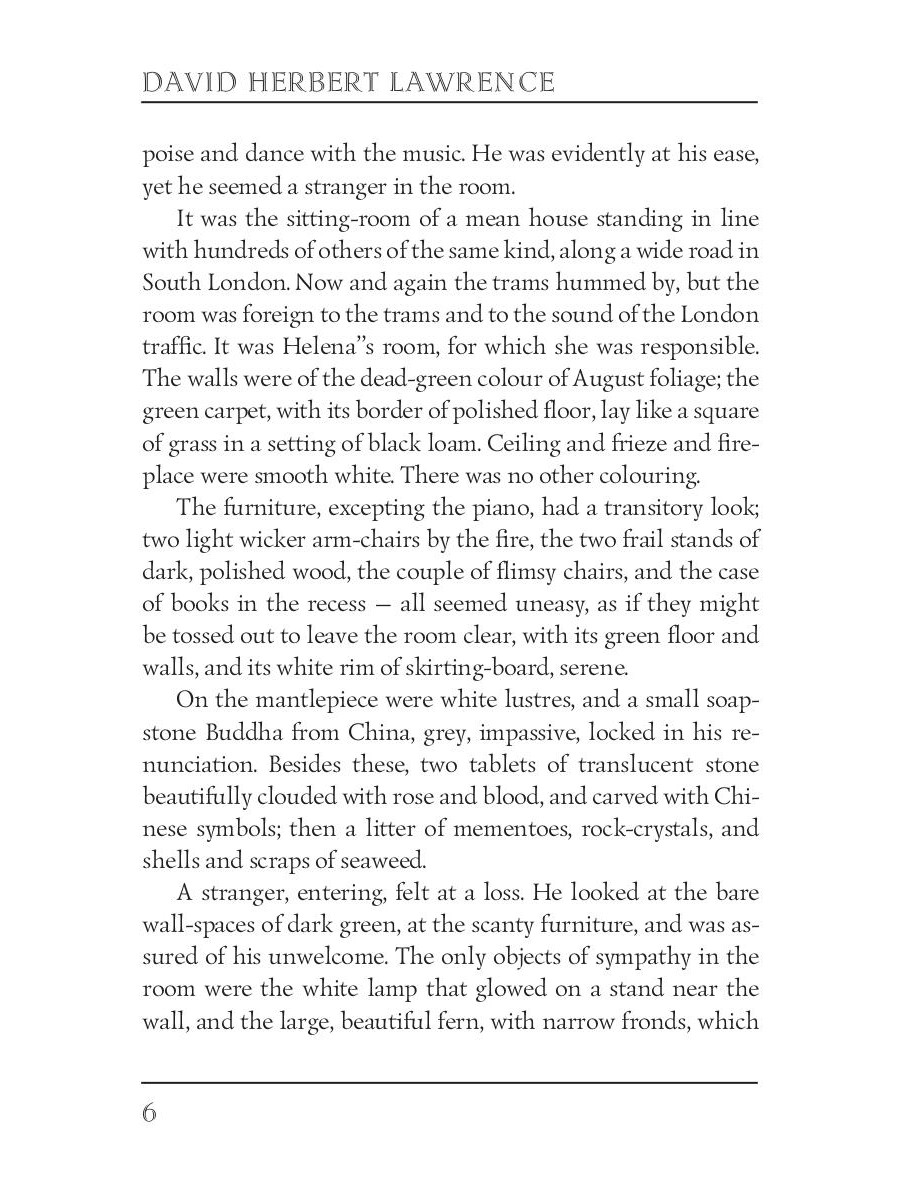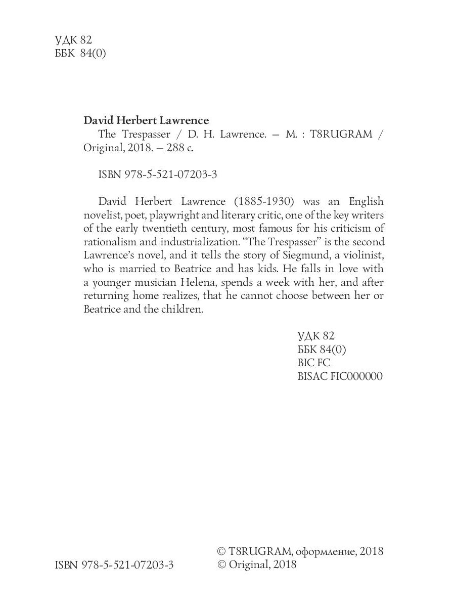 David Herbert Lawrence (1885-1930) was an English novelist, poet, playwright and literary critic, one of the key writers of the early twentieth century, most famous for his criticism of rationalism and industrialization. "The Trespasser" is the second Lawrence's novel, and it tells the story of Siegmund, a violinist, who is married to Beatrice and has kids. He falls in love with a younger musician Helena, spends a week with her, and after returning home realizes, that he cannot choose between her or Beatrice and the children.| Издательство | Т8 RUGRAM |