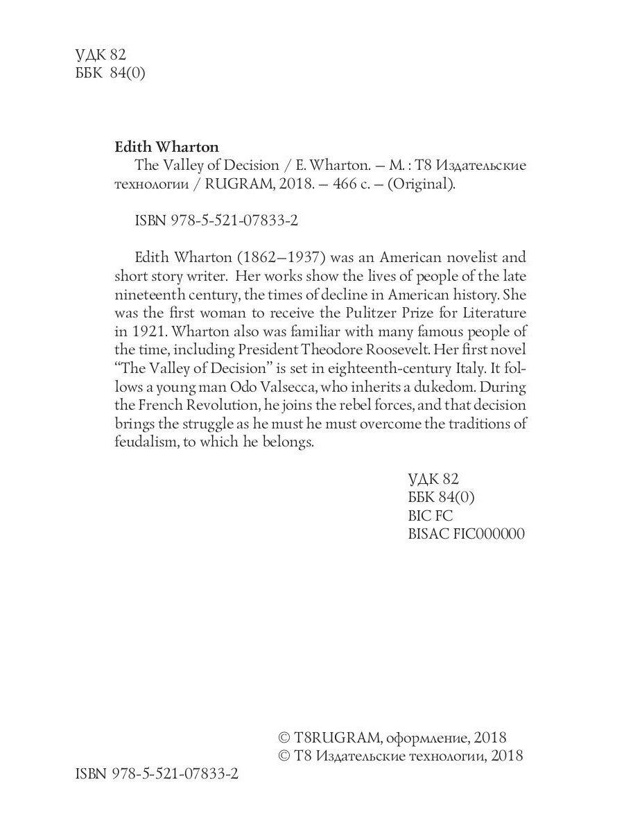Edith Wharton (1862-1937) was an American novelist and short story writer. Her works show the lives of people of the late nineteenth century, the times of decline in American history. She was the first woman to receive the Pulitzer Prize for Literature in 1921. Wharton also was familiar with many famous people of the time, including President Theodore Roosevelt. Her first novel "The Valley of Decision" is set in eighteenth-century Italy. It follows a young man Odo Valsecca, who inherits a dukedom. During the French Revolution, he joins the rebel forces, and that decision brings the struggle as he must he must overcome the traditions of feudalism, to which he belongs.