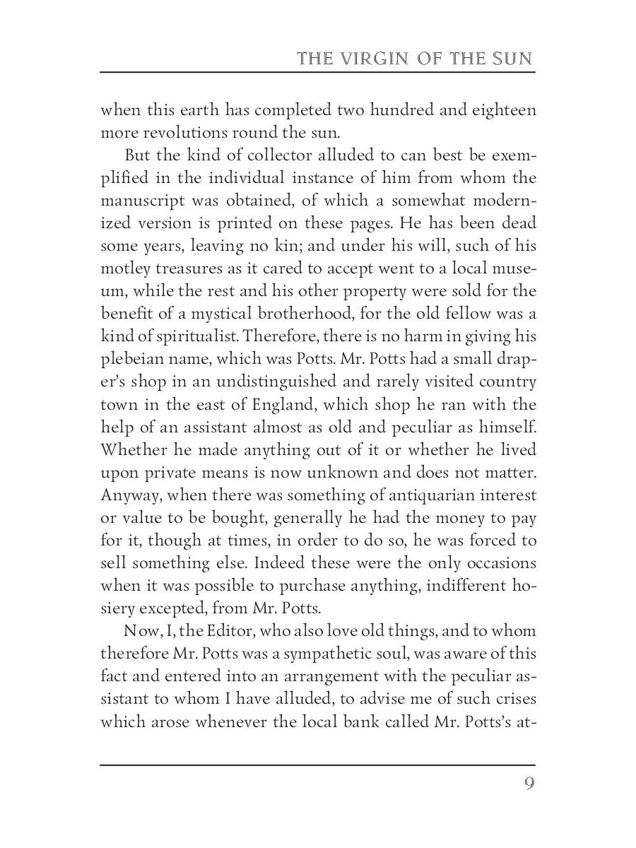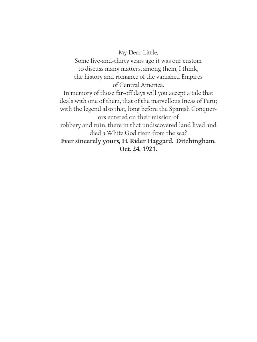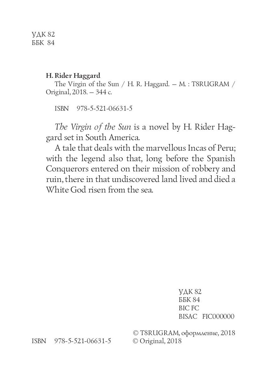 The Virgin of the Sun is a novel by H. Rider Haggard set in South America. A tale that deals with the marvellous Incas of Peru; with the legend also that, long before the Spanish Conquerors entered on their mission of robbery and ruin, there in that undiscovered land lived and died a White God risen from the sea.