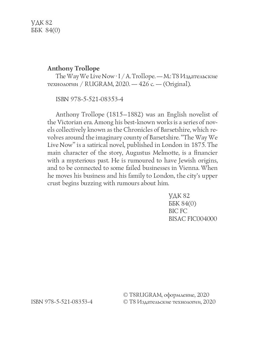 Anthony Trollope (1815-1882) was an English novelist of the Victorian era. Among his best-known works is a series of novels collectively known as the Chronicles of Barsetshire, which revolves around the imaginary county of Barsetshire. "The Way We Live Now" is a satirical novel, published in London in 1875. The main character of the story, Augustus Melmotte, is a financier with a mysterious past. He is rumoured to have Jewish origins, and to be connected to some failed businesses in Vienna. When he moves his business and his family to London, the city's upper crust begins buzzing with rumours about him.| Издательство | Т8 RUGRAM |