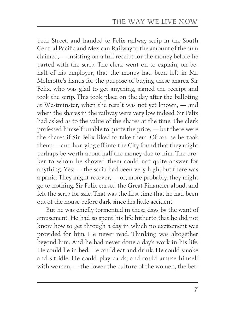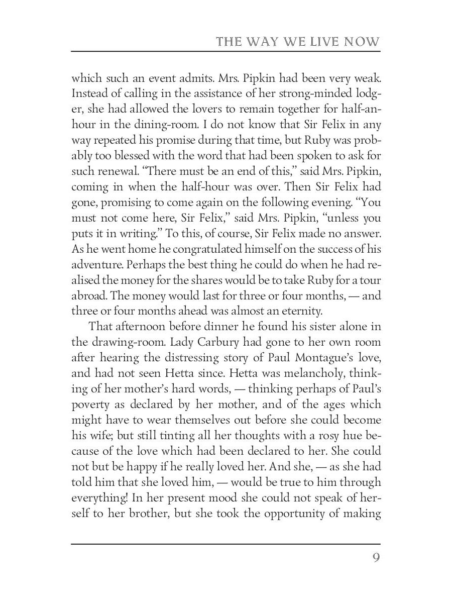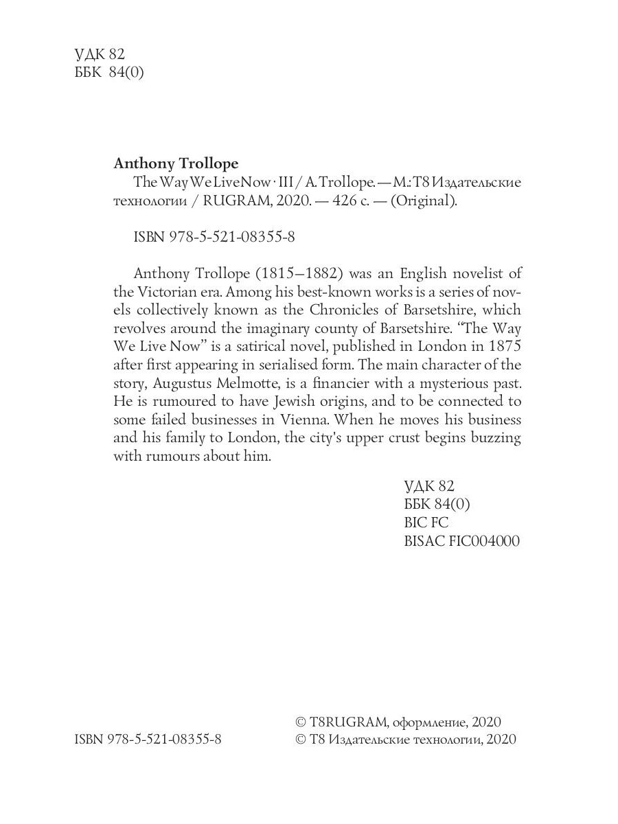 Anthony Trollope (1815-1882) was an English novelist of the Victorian era. Among his best-known works is a series of novels collectively known as the Chronicles of Barsetshire, which revolves around the imaginary county of Barsetshire. "The Way We Live Now" is a satirical novel, published in London in 1875 after first appearing in serialised form. The main character of the story, Augustus Melmotte, is a financier with a mysterious past. He is rumoured to have Jewish origins, and to be connected to some failed businesses in Vienna. When he moves his business and his family to London, the city's upper crust begins buzzing with rumours about him.| Издательство | Т8 RUGRAM |