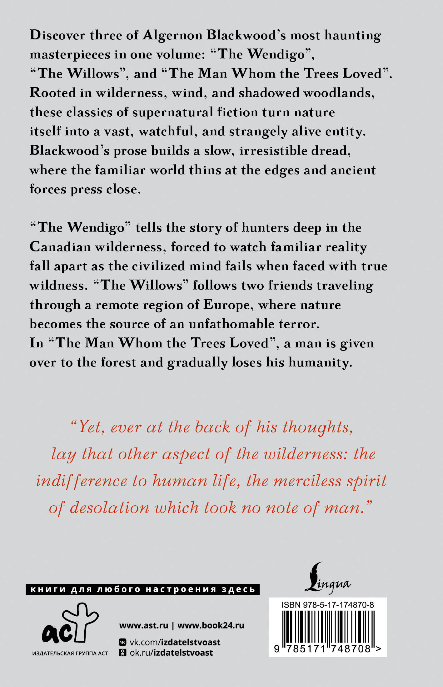 Это сборник о том, как лес смотрит на человека - и как человек не выдерживает этого взгляда. В "The Wendigo" охота в канадской глуши превращается в кошмарный опыт встречи с древним духом леса, который ломает тело и сознание одного из героев, а вместе с ним - веру остальных в привычный, рациональный мир. В "The Willows" двое путешественников попадают в странный, почти нереальный пейзаж, где природа оживает, и шёпот ветра превращается в предвестие чего-то космически враждебного. В "The Man Whom the Trees Loved" тихая любовь к природе постепенно оборачивается одержимостью и медленным растворением человеческого "я" в воле леса. "The Wendigo" - это три вариации на одну тревожную тему: что происходит с человеком, когда цивилизация отступает, а настоящая дикость - древняя, безличная, равнодушная - наконец отвечает на его взгляд. Читайте в оригинале, без адаптации и сокращений!| Издательство | Издательство "АСТ" |
