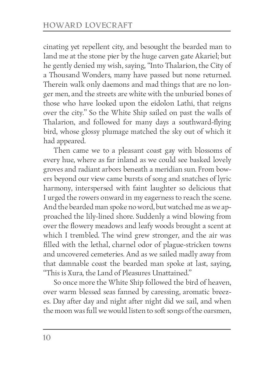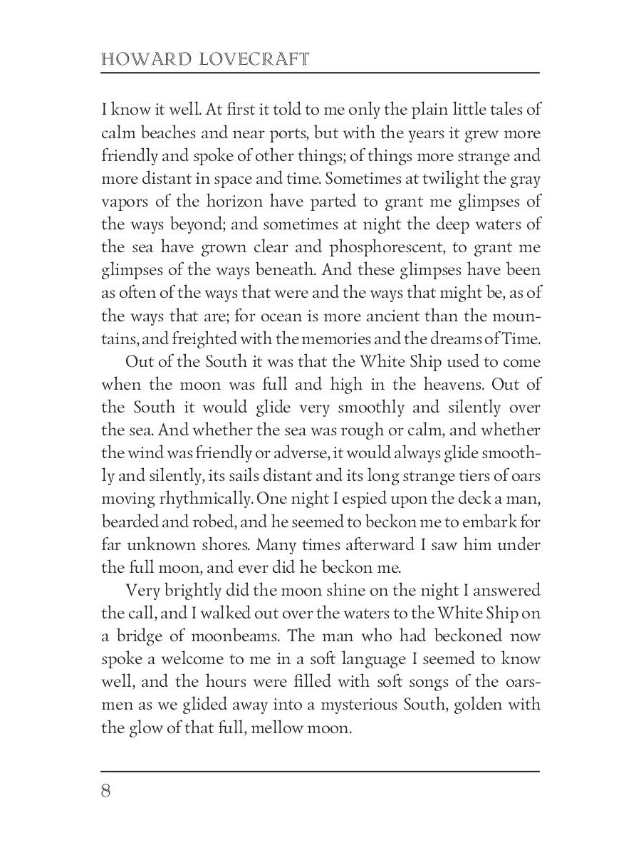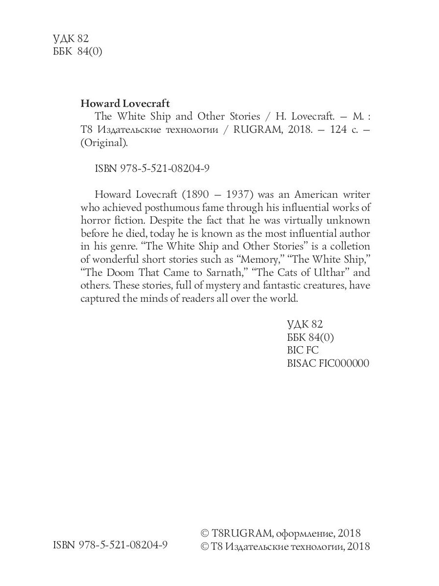 Howard Lovecraft (1890 - 1937) was an American writer who achieved posthumous fame through his influential works of horror fiction. Despite the fact that he was virtually unknown before he died, today he is known as the most influential author in his genre. "The White Ship and Other Stories" is a colletion of wonderful short stories such as "Memory", "The White Ship", "The Doom That Came to Sarnath", "The Cats of Ulthar" and others. These stories, full of mystery and fantastic creatures, have captured the minds of readers all over the world.