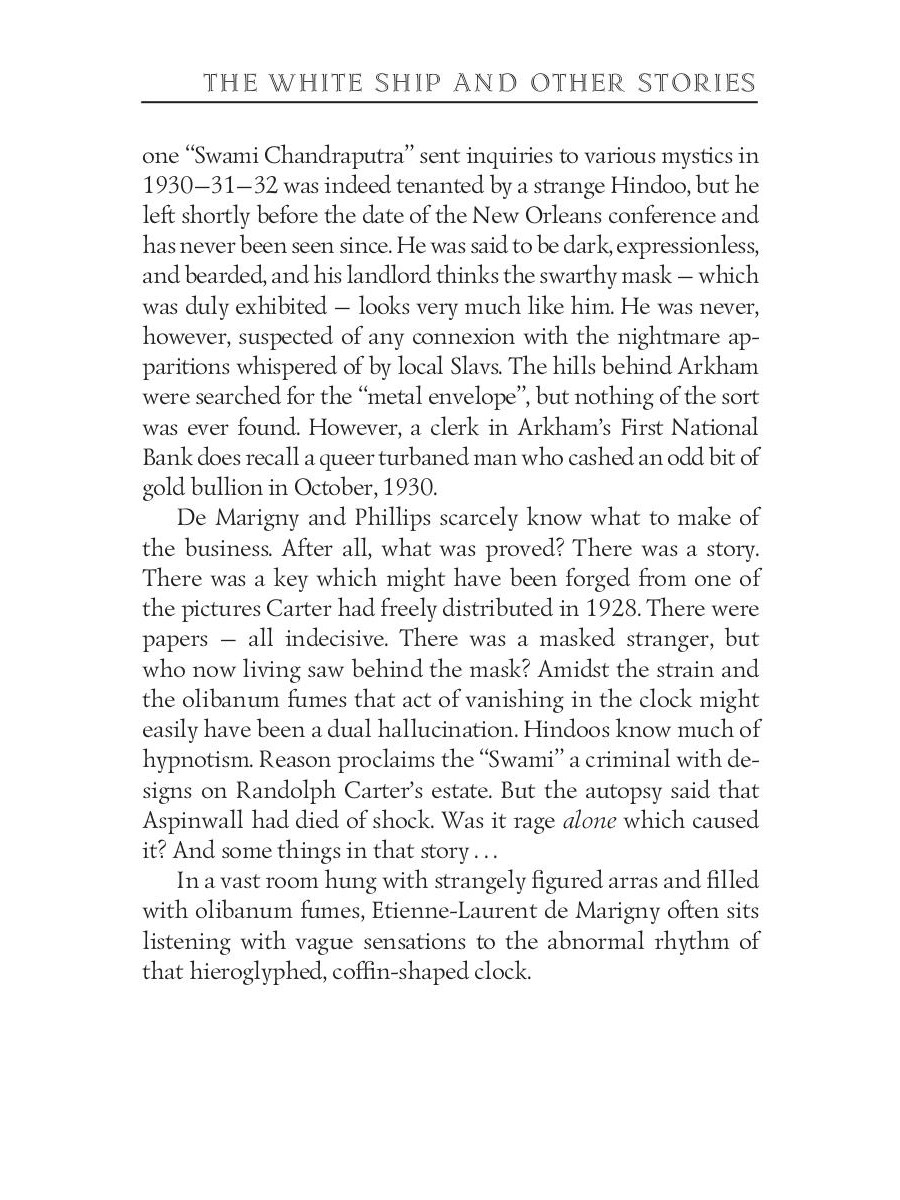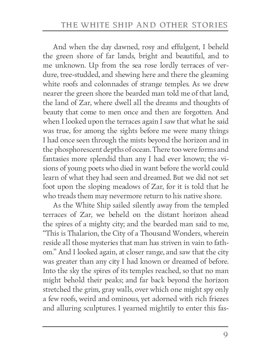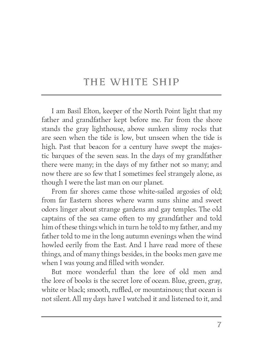 Howard Lovecraft (1890 - 1937) was an American writer who achieved posthumous fame through his influential works of horror fiction. Despite the fact that he was virtually unknown before he died, today he is known as the most influential author in his genre. "The White Ship and Other Stories" is a colletion of wonderful short stories such as "Memory", "The White Ship", "The Doom That Came to Sarnath", "The Cats of Ulthar" and others. These stories, full of mystery and fantastic creatures, have captured the minds of readers all over the world.