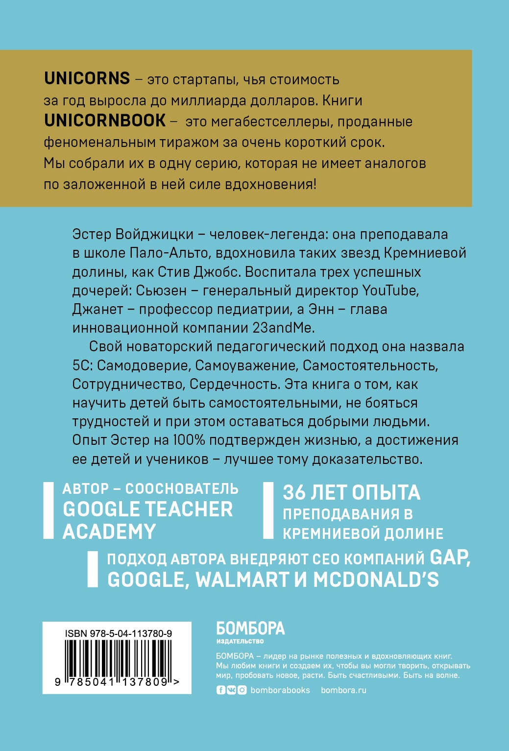 СОВОКУПНЫЙ ТИРАЖ В РОССИИ - 50 000 ЭКЗЕМПЛЯРОВ! Педагогам и родителям Нобелевских премий не дают, а зря. Вырастить ребенка и воспитать его - что может быть важнее? Автор этой книги Эстер Войджицки, или, как ее ласково называют, Woj, наверняка могла бы быть первым претендентом. Она стала не только выдающимся педагогом, легендой Америки, но и воспитала трех потрясающих дочерей. Старшая дочь Сьюзен - генеральный директор YouTube, Джанет - профессор педиатрии, а Энн - глава инновационной компании генетического тестирования 23andMe. Эстер просто хотела вырастить самостоятельных детей, из которых потом получатся сильные независимые взрослые. Она выпустила не одну сотню учеников, и все они вспоминают, как ее вера в их силы помогла им найти себя. Свой метод воспитания она назвала 5С: Самодоверие, Самоуважение, Самостоятельность, Сотрудничество, Сердечность. Система 5С, считает Эстер, работает всегда и везде, ей не важны возраст, культура и обстоятельства. А еще на нее никогда не поздно перейти. А родитель, уже наломавший дров, может все исправить, помочь и себе, и ребенку. Из этой книги вы узнаете: - Как научиться доверять ребенку и заслужить его доверие. - Чем плоха гиперопека. - С какого возраста нужно приучать детей к самостоятельности. - Как позволить ребенку самому выбрать свой путь. - Как научить ребенка быть благодарным. Об авторе: Эстер Войджицки (Woj) - знаменитый американский педагог, заместитель председателя консультативного совета Creative Commons, работала консультантом по образованию в Google. Woj также известна как самая знаменитая мать Силиконовой долины, воспитавшая трех наиболее успешных женщин в Соединенных Штатах. Семью Войджицки иногда с любовью называют «королевской властью Силиконовой долины». Новаторская программа повышения квалификации для педагогов, которую создала Эстер, известна во всем мире и признана Фондом Валленберга как важнейшая в «совершенствовании преподавания»| Издательство | ООО "Издательство "Эксмо" |