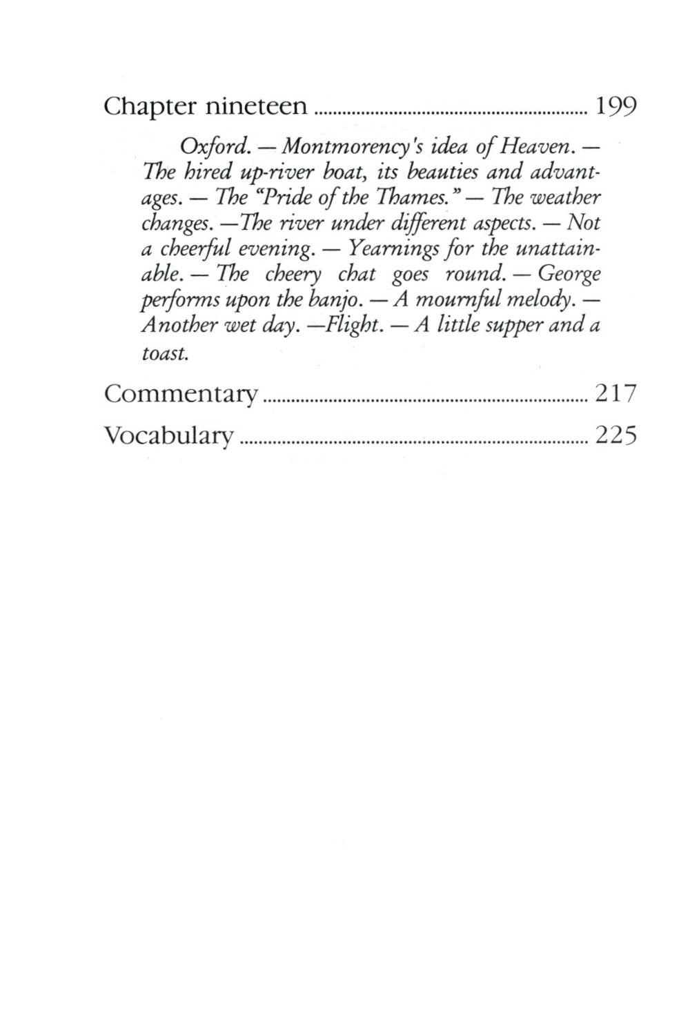 В книгу включены избранные главы из повести известного английского писателя-юмориста Джерома Клапки Джерома «Трое в лодке, не считая собаки». Неадаптированный текст снабжён комментариями и кратким словарём. Словарь содержит толкования некоторых слов, которые обычно не входят в активный словарный запас учащихся. Комментарии облегчают понимание лексико-грамматических трудностей, а также поясняют реалии исторического, культурно-бытового и отчасти географического характера. Вопросы направлены на проверку понимания прочитанного и развитие навыков устной речи. Книга предназначена для учащихся 9-11 классов школ с углублённым изучением английского языка и для студентов неязыковых вузов.| Издательство | Каро |