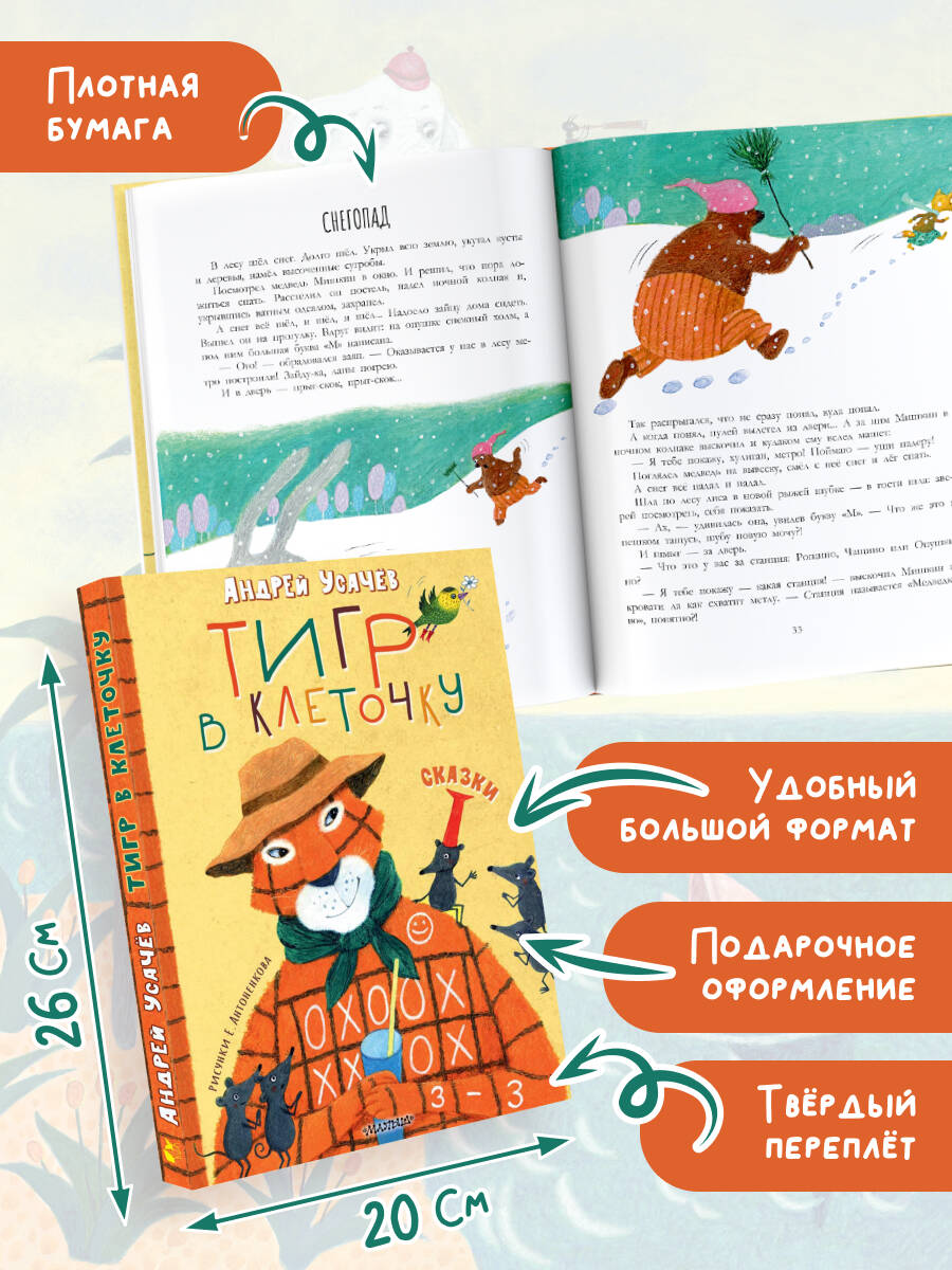 В книгу "Тигр в клеточку" вошли знаменитые сказки Андрея Усачёва - мастера доброго юмора и мудрых историй. Маленькие сказки познакомят малышей с любопытными зверями, которые спорят, шутят, попадают в забавные ситуации, но всегда выручают друг друга. С шутками и играми герои учатся принимать себя, ценить дружбу и находить выход из любых ситуаций. Коротенькие сказки, динамичный сюжет, яркие иллюстрации Евгения Антоненкова идеальны для чтения малышам, а потом и для первого самостоятельного чтения. Для детей до 3-х лет.| Издательство | Издательство "АСТ" |