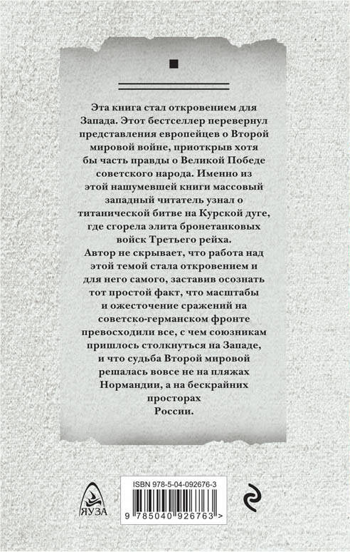 Эта книга стала откровением для Запада. Этот бестселлер перевернул представления европейцев о Второй мировой войне, приоткрыв хотя бы часть правды о Великой Победе советского народа. Именно из этой нашумевшей книги массовый западный читатель узнал о титанической битве на Курской дуге, где сгорела элита бронетанковых войск Третьего рейха. Автор не скрывает, что работа над этой темой стала откровением и для него самого, заставив осознать тот простой факт, что масштабы и ожесточение сражений на советско-германском фронте превосходили все, с чем союзникам пришлось столкнуться на Западе, и что судьба Второй мировой решалась вовсе не на пляжах Нормандии, а на бескрайних просторах России.| Издательство | ООО "Издательство "Эксмо" |