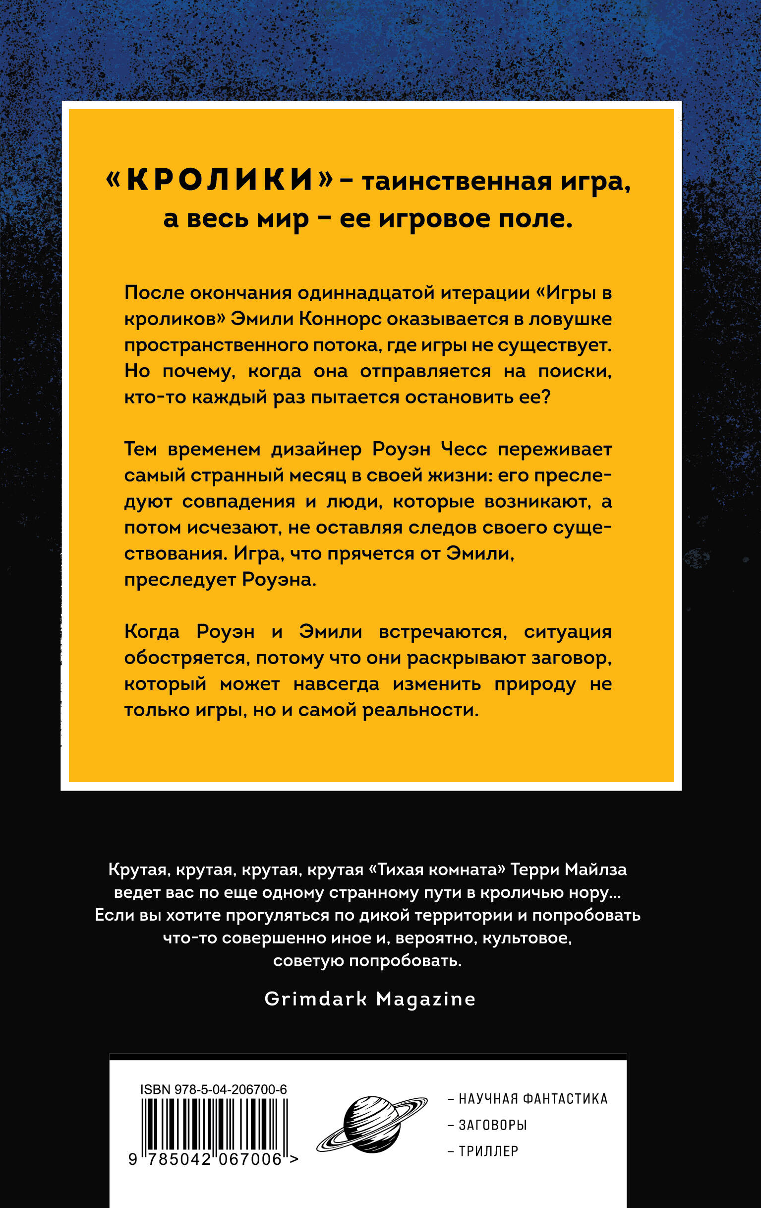 Слухи и легенды, связанные с таинственной подпольной игрой под названием «Кролики», обретает новое измерение. «Кролики» - таинственная игра, а весь мир - ее игровое поле. После окончания одиннадцатой итерации «Игры в кроликов» Эмили Коннорс оказывается в ловушке пространственного потока, где игры не существует. Но почему, когда она отправляется на ее поиски, кто-то каждый раз пытается остановить ее? Тем временем дизайнер Роуэн Чесс переживает самый странный месяц в своей жизни: его преследуют совпадения и люди, которые возникают, а потом исчезают, не оставляя следов своего существования. Игра, что прячется от Эмили, преследует Роуэна. Когда Роуэн и Эмили встречаются, ситуация обостряется, потому что они раскрывают заговор, который может навсегда изменить природу не только игры, но и самой реальности. «Еще одно захватывающее дух приключение, полное тайн». - Publishers Weekly «Крутая, крутая, крутая, крутая "Тихая комната" Терри Майлза ведет вас по еще одному странному пути в кроличью нору… Если вы хотите прогуляться по дикой территории и попробовать что-то совершенно иное и, вероятно, культовое, советую попробовать». - Grimdark Magazine «Роман не только продолжает то, на чем остановилась первая книга, но и сохраняет умопомрачительную интригу и таинственную энергию. Увлекательное путешествие, наполненное неожиданными поворотами и неустанным поиском ответов». - The BiblioSanctum «В этом захватывающем продолжении возвращается сверхсекретная охота на совпадения в альтернативной реальности, известная как "Кролики". В результате получилось еще одно захватывающее дух приключение, полное загадок и появлений уже знакомых персонажей». - Publishers Weekly
