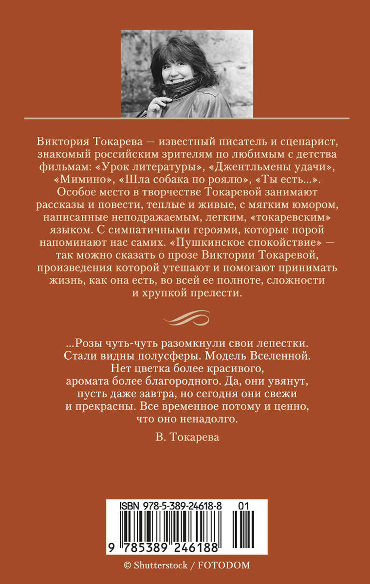 Виктория Токарева - известный писатель и сценарист, знакомый российским зрителям по любимым с детства фильмам: "Урок литературы", "Джентльмены удачи", "Мимино", "Шла собака по роялю", "Ты есть...". Особое место в творчестве Токаревой занимают рассказы и повести, теплые и живые, с мягким юмором, написанные неподражаемым, легким, "токаревским" языком. С симпатичными героями, которые порой напоминают нас самих. "Пушкинское спокойствие" - так можно сказать о прозе Виктории Токаревой, произведения которой утешают и помогают принимать жизнь, как она есть, во всей ее полноте, сложности и хрупкой прелести. В издание вошли прозаические произведения Виктории Токаревой, включая повести "Тихая музыка за стеной", "Ангел-хранитель", рассказы "Ни с тобой, ни без тебя", "Хрустальный башмачок", "Брат и сестра", "Короткие гудки" и др.| Издательство | Азбука-Аттикус Издат.группа ООО |