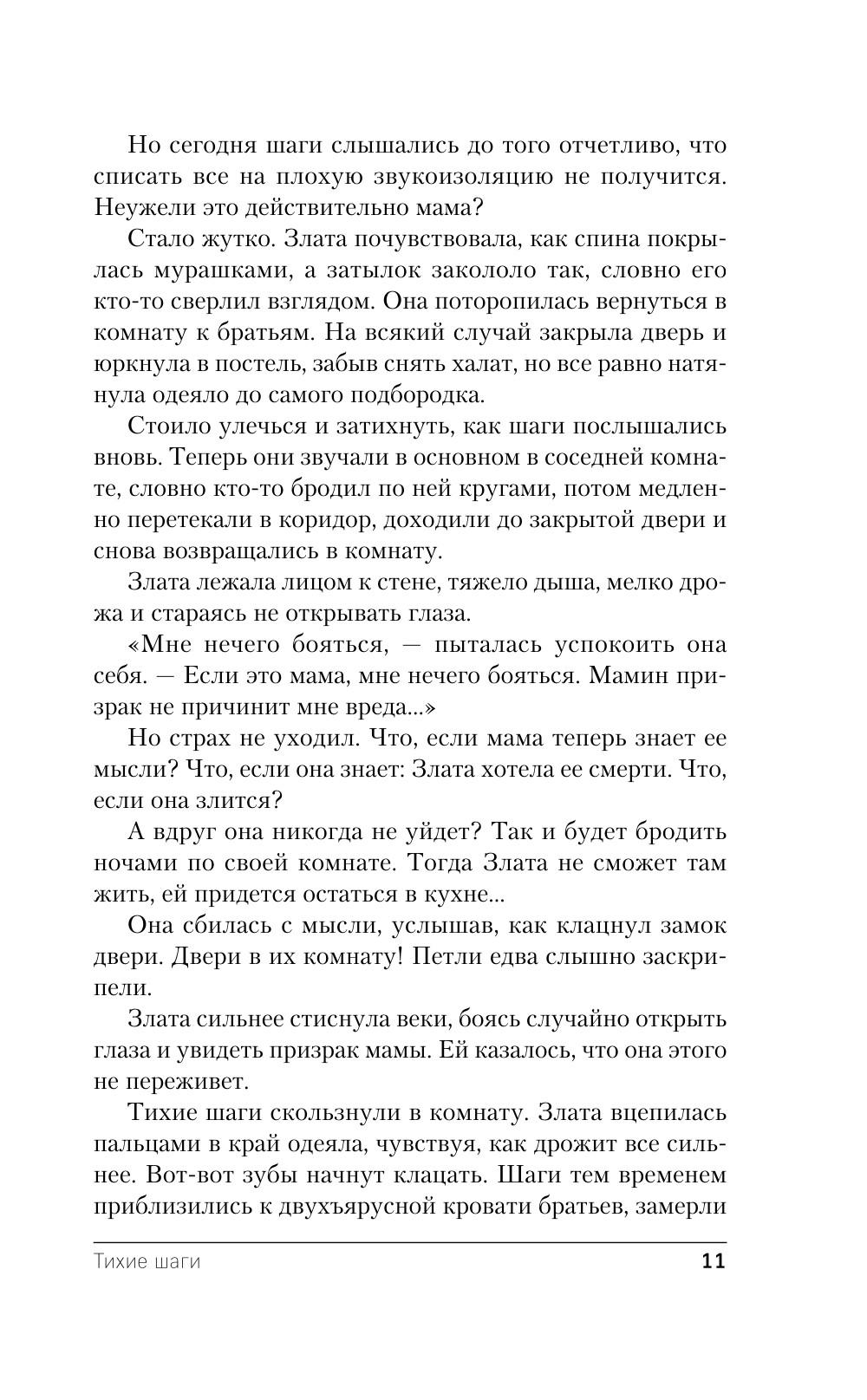 «Тихие шаги» - новинка популярной российской писательницы Лены Обуховой, вошедшая в мистический цикл «Городские легенды II: Медвежье озеро». Захватывающая история с неожиданной развязкой в духе «Сверхъестественного». Уже знакомым нам героям предстоит столкнуться с новой чередой загадочных убийств. Шелково вновь потрясла серия чудовищных убийств. Но полиция не может провести параллель между жертвами. На помощь органам вновь приходят Влад и Юля Федоровы. Ведь, похоже, преступления совершает вовсе не человек, а семья Федоровых давно научилась разбираться с нечистью.