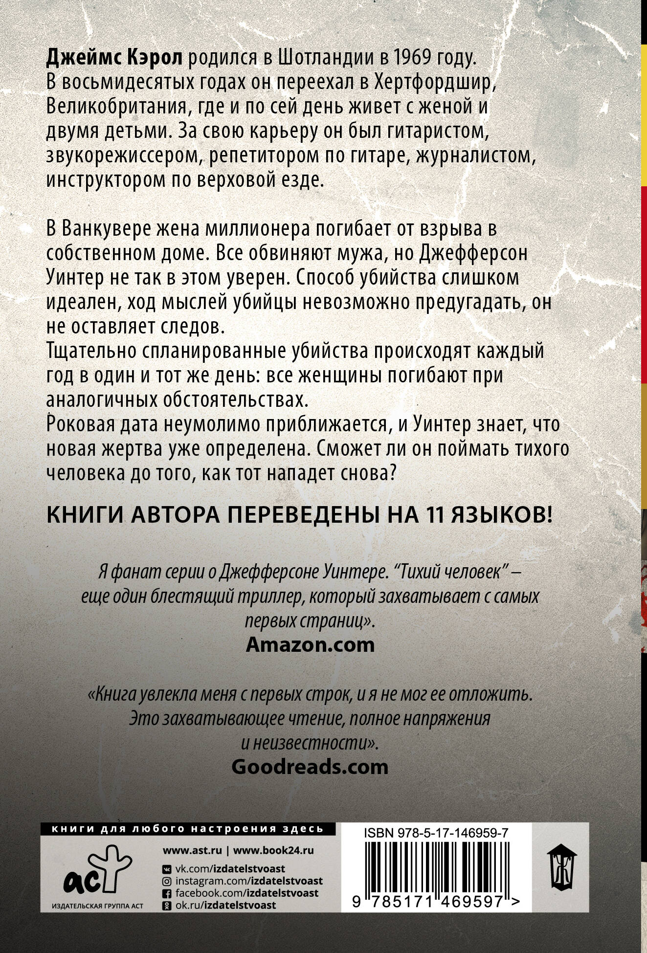 В Ванкувере жена миллионера погибает от взрыва в собственном доме. Все обвиняют мужа, но Джефферсон Уинтер не так в этом уверен. Способ убийства слишком идеален, ход мыслей убийцы невозможно предугадать, он не оставляет следов. Тщательно спланированные убийства происходят каждый год в один и тот же день: все женщины погибают при аналогичных обстоятельствах. Роковая дата неумолимо приближается, и Уинтер знает, что новая жертва уже определена. Сможет ли он опознать тихого человека до того, как тот нападет снова?| Издательство | ИЗДАТЕЛЬСТВО "АСТ" |