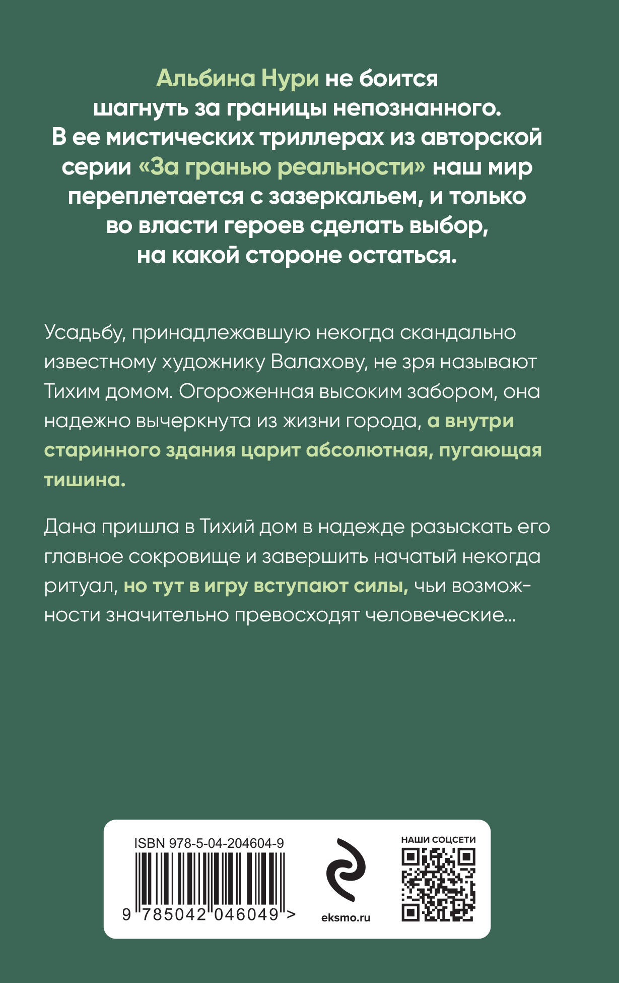 Усадьбу, принадлежащую некогда скандально известному художнику Валахову, не зря называют Тихим домом. Огороженная высоким забором, она надежно вычеркнута из жизни города, а внутри старинного здания царит абсолютная пугающая тишина. Дана пришла в Тихий дом в надежде разыскать его главное сокровище и завершить начатый некогда ритуал, но тут в игру вступают силы, чьи возможности значительно превосходят человеческие… Романы Альбины Нури - целый мир, в котором реальность переплетается с мистикой и потусторонним миром, где действуют законы, отличные от законов разума. Герои сталкиваются с необъяснимыми явлениями, идущими вразрез с обыденной картиной мира, и им предстоит через многое пройти, чтобы вернуть свою жизнь в привычное русло. Романы Альбины Нури нравятся как читателям, так и критикам.| Издательство | ООО "Издательство "Эксмо" |