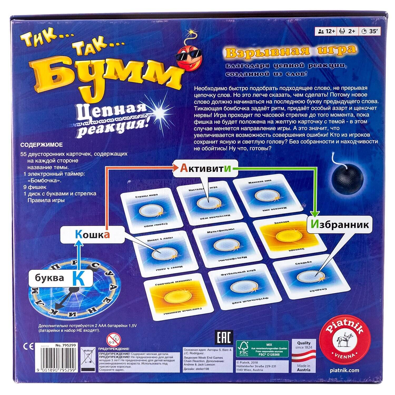 Взрывная игра благодаря цепной рекции, созданной из слов! Необходимо быстро подобрать слово, не прерывая цепочку слов. Но это легче сказать, чем сделать! Потому новое слово должно начинаться на последнюю букву предыдущего слова. Тикающая бомбочка задает ритм, придает особый азарт и щекочет нервы! Игра проходит по часовой стрелке до того момента, пока фишка не будет положена на желтую карточку с темой- в этом случае меняется направление игры. А это значит, что увеличивается возможность совершения ошибки. Кто из игроков сохранит ясную и светлую голову? Без собранности и находчивости не обойтись! Ну что, готовы?| Издательство | ЮНИТОЙС МСК ООО |
