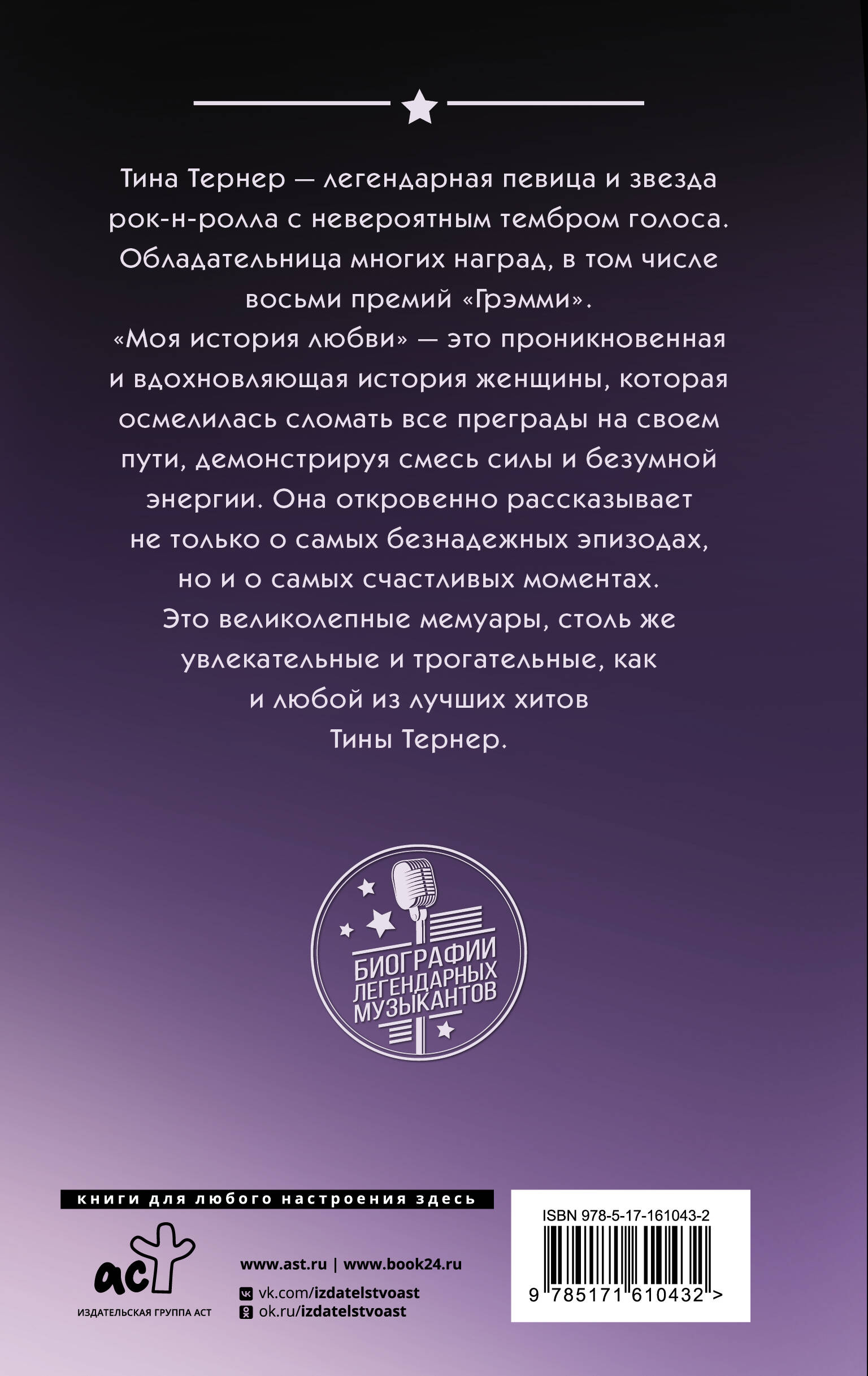 Тина Тернер - легендарная певица и звезда рок-н-ролла с невероятным тембром голоса. Обладательница многих наград, в том числе восьми премий "Грэмми". За свой артистизм, темперамент и сценическую экспрессивность по праву носит титул "Королевы рок-н-ролла", а журнал "Rolling Stone" назвал ее одной из величайших певиц современности. Свою профессиональную карьеру Тина Тернер начала, познакомившись с будущим мужем, Айком Тернером, выступая в составе Ike & Tina Turner Revue. Первый настоящий успех пришел с синглом "River Deep, Mountain High", музыкальным продюсером которой был знаменитый Фил Спектр. После развода с Айком она начала работать над сольной карьерой, формируя собственный стиль, и добилась феноменального успеха в 80-х. "Моя история любви" - это проникновенная и вдохновляющая история женщины, которая осмелилась сломать все преграды на своем пути, демонстрируя смесь силы и безумной энергии. Она откровенно рассказывает не только о самых безнадежных эпизодах, но и о самых счастливых моментах. Это великолепные мемуары, столь же увлекательные и трогательные, как и любой из лучших хитов Тины Тернер.| Издательство | Издательство "АСТ" |