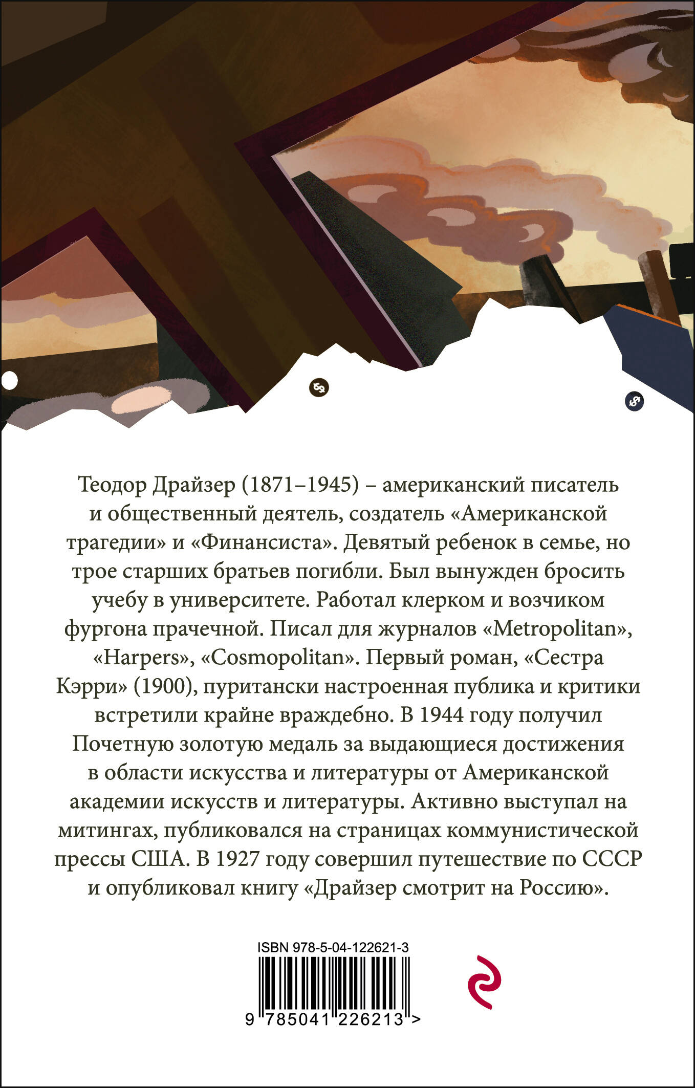 Теодор Драйзер (1871-1945) - американский писатель и общественный деятель, создатель «Американской трагедии» и «Финансиста». Девятый ребенок в семье, но трое старших братьев погибли. Был вынужден бросить учебу в университете. Работал клерком и возчиком фургона прачечной. Писал для журналов «Metropolitan», «Harpers», «Cosmopolitan». Первый роман «Сестра Кэрри» (1900) пуритански настроенная публика и критики встретили крайне враждебно. В 1944 году получил Почетную золотую медаль за выдающиеся достижения в области искусства и литературы от «Американской академии искусств и литературы». Активно выступал на митингах, публиковался на страницах коммунистической прессы США. В 1927 году совершил путешествие по СССР и опубликовал книгу «Драйзер смотрит на Россию».| Издательство | ООО "Издательство "Эксмо" |