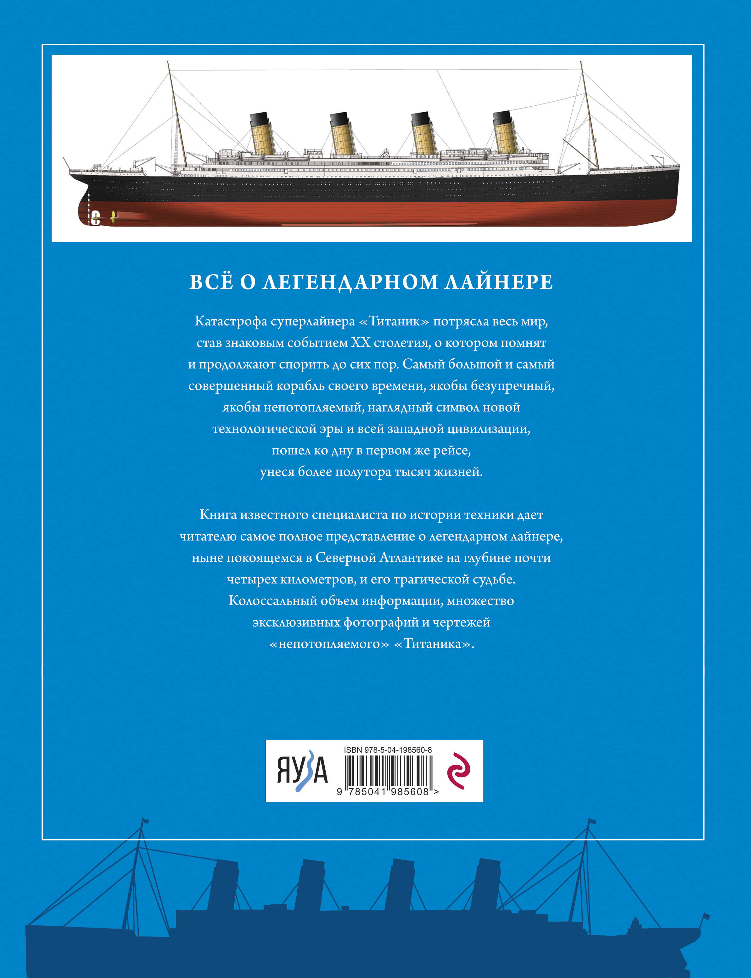 ВСЁ О ЛЕГЕНДАРНОМ ЛАЙНЕРЕ! Катастрофа суперлайнера «Титаник» потрясла весь мир, став знаковым событием XX столетия, о котором помнят и продолжают спорить до сих пор. Самый большой и самый совершенный корабль своего времени, якобы безупречный, якобы непотопляемый, наглядный символ новой технологической эры и всей западной цивилизации, пошел ко дну в первом же рейсе, унеся более полутора тысяч жизней. Книга известного специалиста по истории техники дает читателю самое полное представление о легендарном лайнере, ныне покоящемся в Северной Атлантике на глубине почти четырех километров, и его трагической судьбе. Колоссальный объем информации, множество эксклюзивных фотографий и чертежей «непотопляемого» «Титаника».| Издательство | Яуза-пресс ООО |