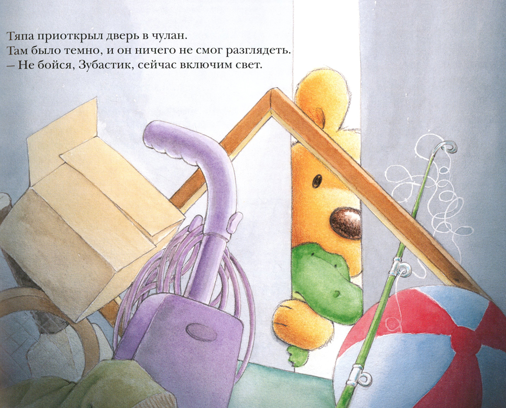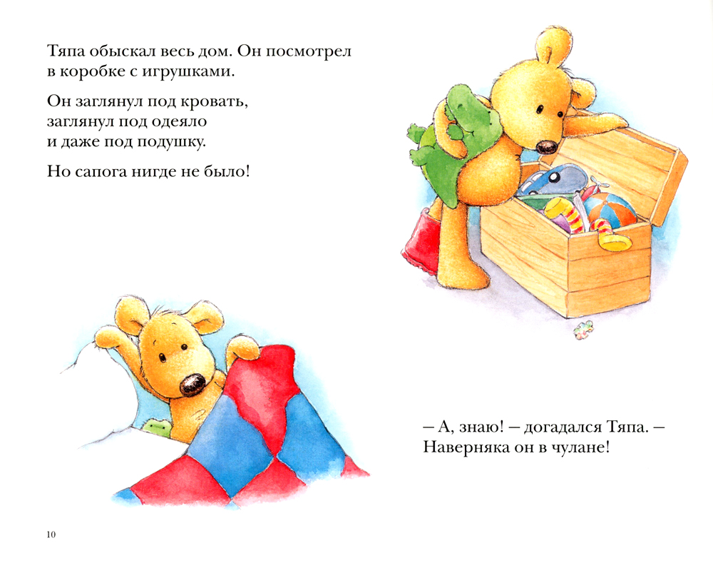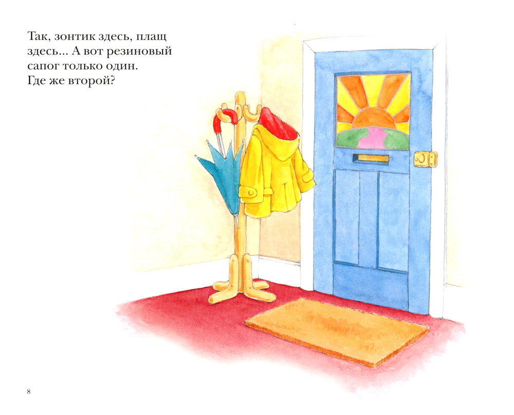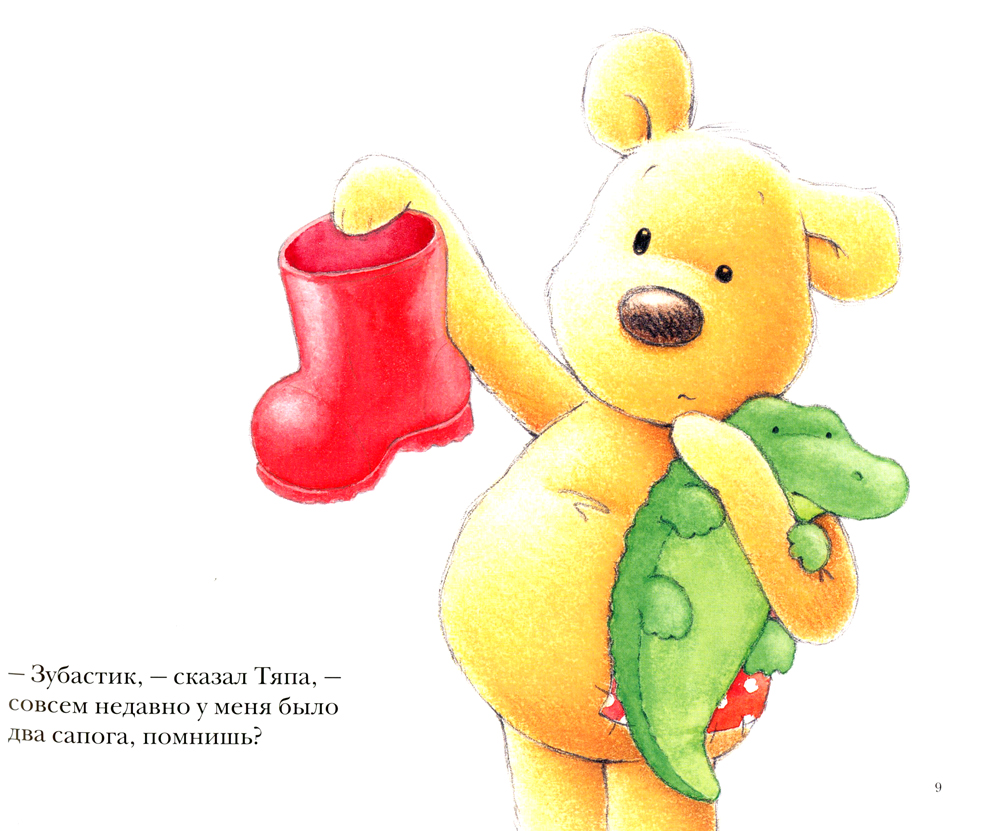 С самого утра на улице шёл дождь, и Тяпа решил отправиться во двор, чтобы пошлёпать по лужам. Но в прихожей он обнаружил только один резиновый сапог. Где же второй? Тяпа перевернул вверх дном весь дом и, в конце концов, нашёл сапог в самом дальнем углу чулана, но умудрился при этом потерять в куче старого хлама нечто гораздо более важное - своего лучшего друга, игрушечного крокодильчика по имени Зубастик. Только разложив все вещи в доме по своим местам и наведя порядок, Тяпа смог отыскать Зубастика и с чистой совестью отправиться на прогулку. Четкие, крупные иллюстрации, постраничное совпадение картинки и текста, близкий малышам сюжет и понятный юмор - всё это делает книгу идеальной для чтения детям самого младшего возраста.| Издательство | Мелик-Пашаев |