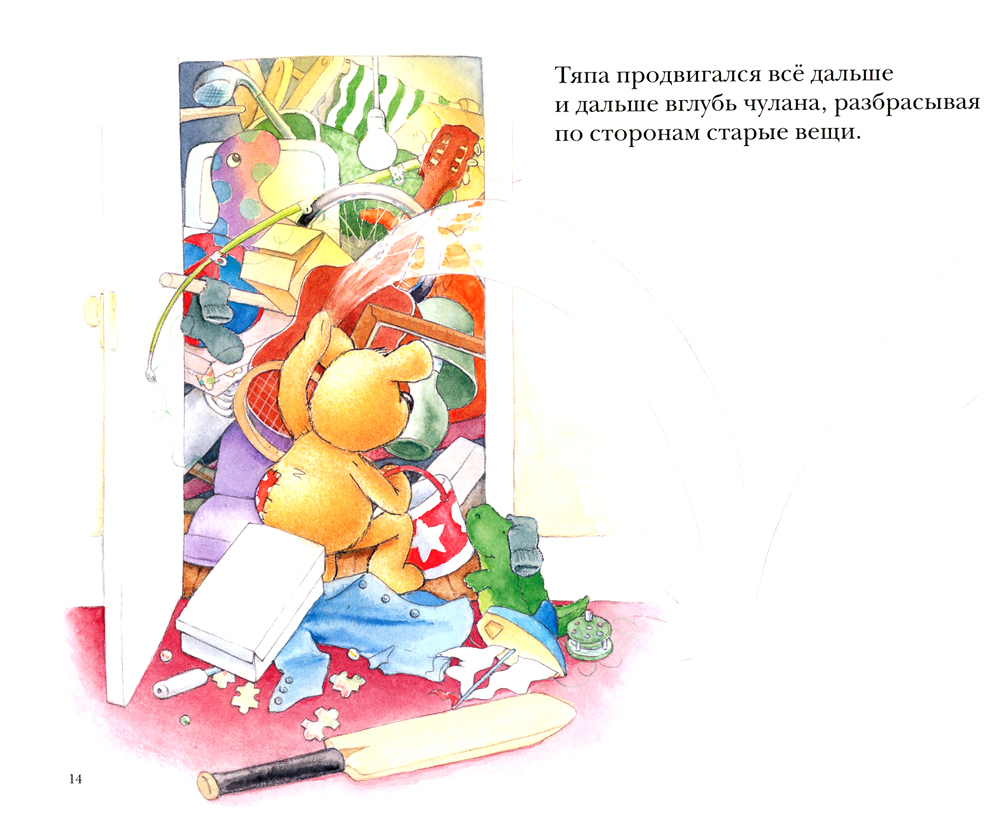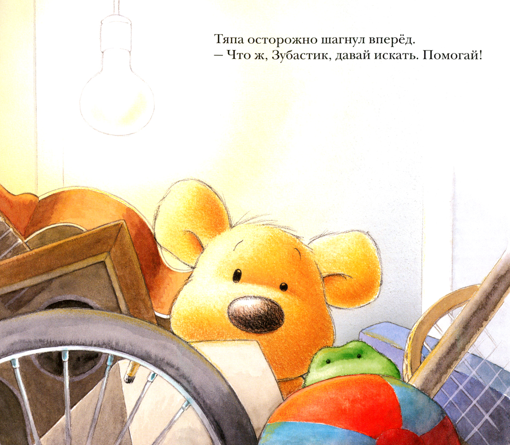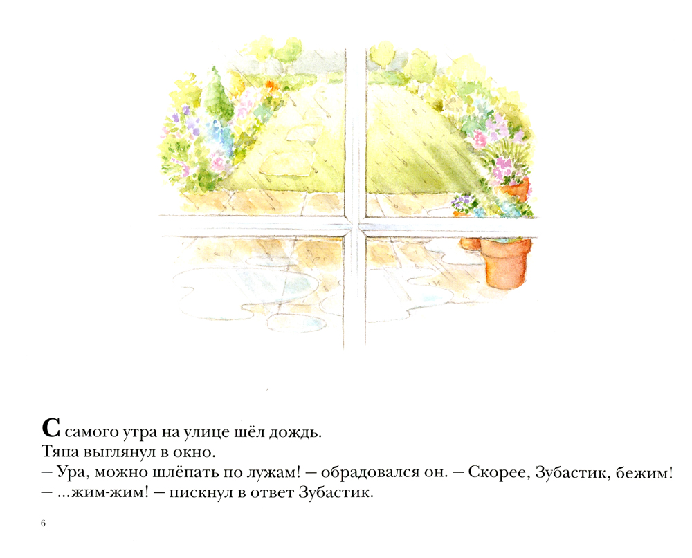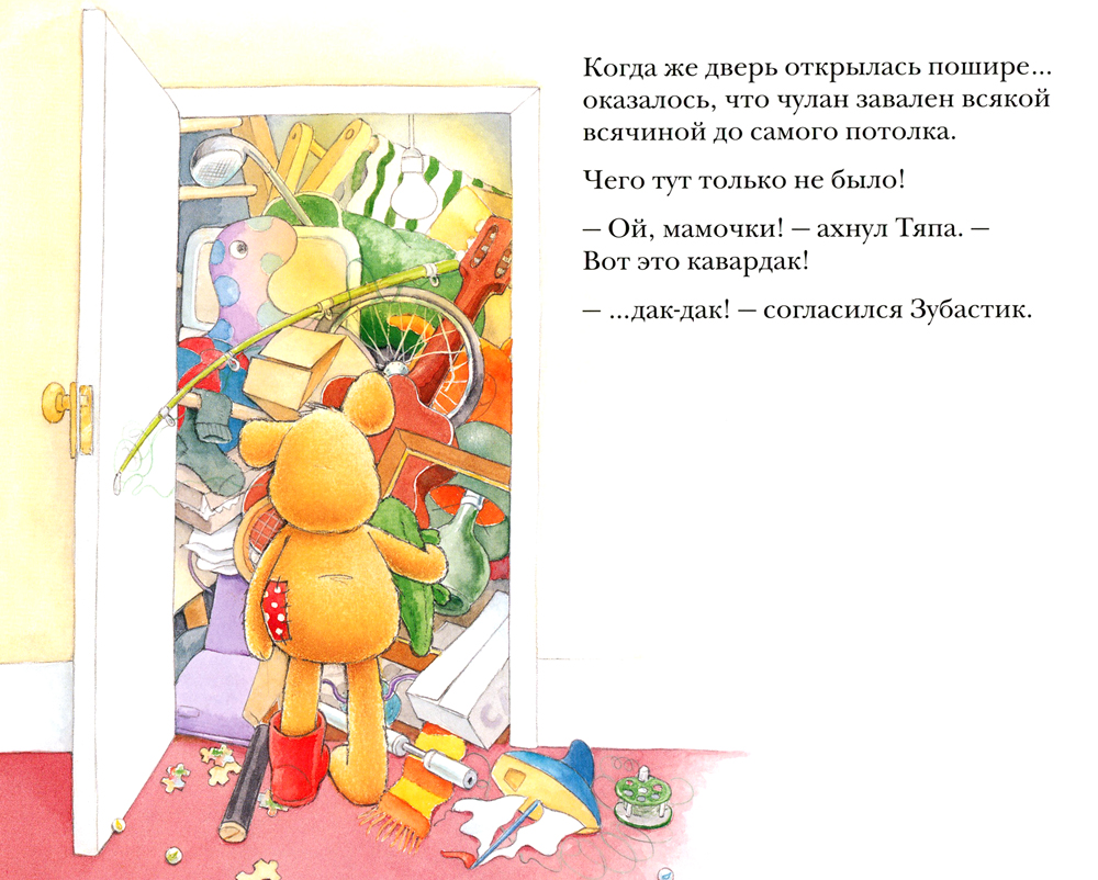 С самого утра на улице шёл дождь, и Тяпа решил отправиться во двор, чтобы пошлёпать по лужам. Но в прихожей он обнаружил только один резиновый сапог. Где же второй? Тяпа перевернул вверх дном весь дом и, в конце концов, нашёл сапог в самом дальнем углу чулана, но умудрился при этом потерять в куче старого хлама нечто гораздо более важное - своего лучшего друга, игрушечного крокодильчика по имени Зубастик. Только разложив все вещи в доме по своим местам и наведя порядок, Тяпа смог отыскать Зубастика и с чистой совестью отправиться на прогулку. Четкие, крупные иллюстрации, постраничное совпадение картинки и текста, близкий малышам сюжет и понятный юмор - всё это делает книгу идеальной для чтения детям самого младшего возраста.| Издательство | Мелик-Пашаев |
