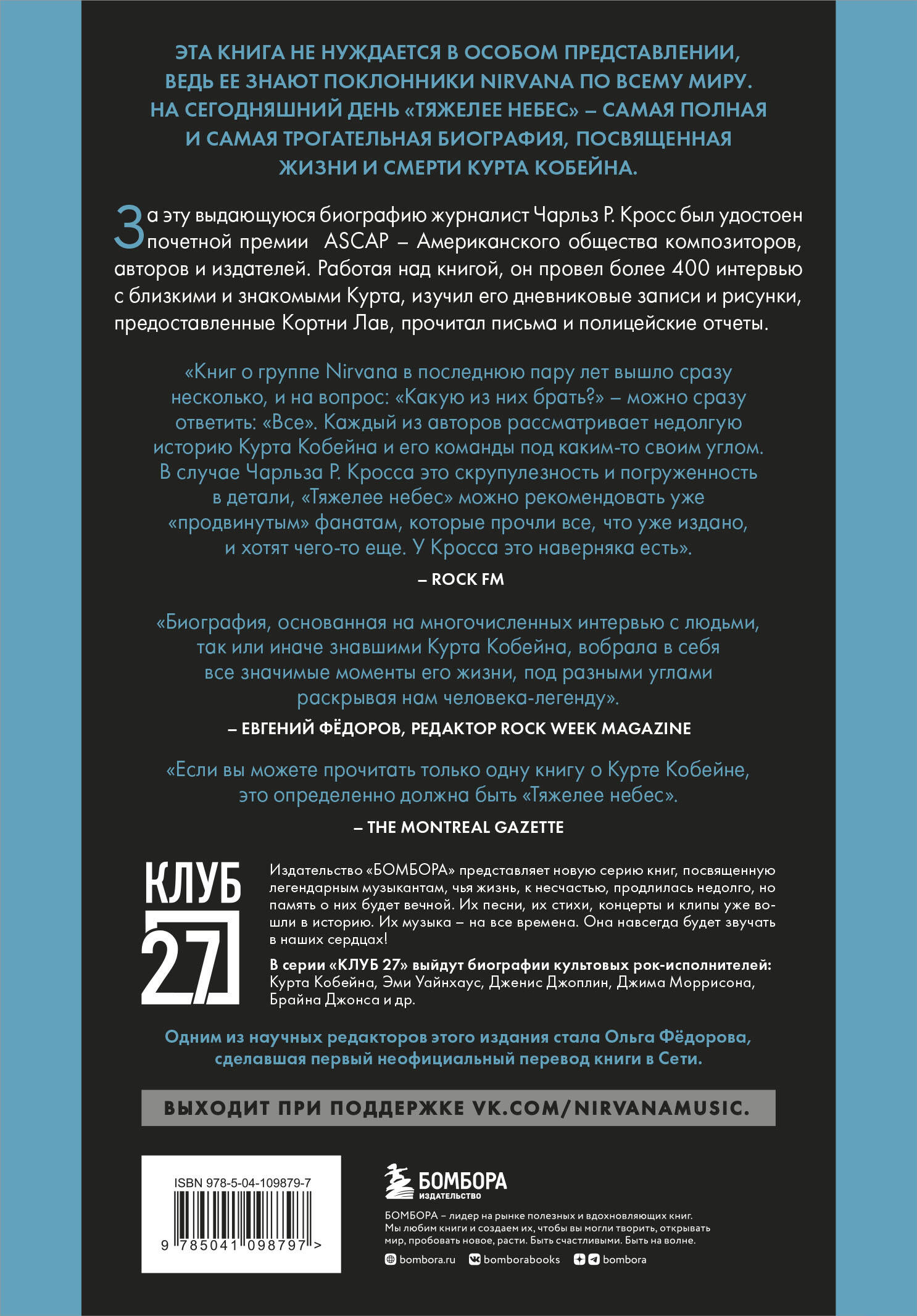 «Тяжелее небес» - самая полная биография, написанная о Курте Кобейне на сегодняшний день. Эта книга не нуждается в особом представлении, ведь ее знают поклонники Nirvana по всему миру. Она переведена более чем на 20 языков, и теперь официальное издание выходит и в России. А в 2002-м году ее автор Чарльз Р. Кросс был удостоен почетной премии ASCAP - Американского общества композиторов, авторов и издателей. Чтобы написать «Тяжелее небес», Чарльз Кросс провел более 400 интервью с близкими и знакомыми Курта, изучил его дневниковые записи и рисунки, предоставленные Кортни Лав, прочитал письма и полицейские отчеты - ничто не ускользнуло от взгляда опытного биографа. Но вместе с тем, несмотря на достоверность изложенных фактов, эта книга - прежде всего, эмоциональная и трогательная, очень личная история писателя. История о том, каким человеком на самом деле был Курт, каким его знали те, кто любил и ненавидел его. Как прошло его детство, его первые неуверенные шаги в музыке, пик славы и последние часы. Эта книга не только тщательная реконструкция Курта Кобейна, но и признание в любви его творчеству, его песням, которые продолжают звучать, жить и вдохновлять новые поколения. Выходит в России при информационной поддержке https://vk.com/nirvanamusic. Одним из научных редакторов этого издания стала Ольга Федорова, сделавшая первый неофициальный перевод книги в сети.| Издательство | ООО "Издательство "Эксмо" |