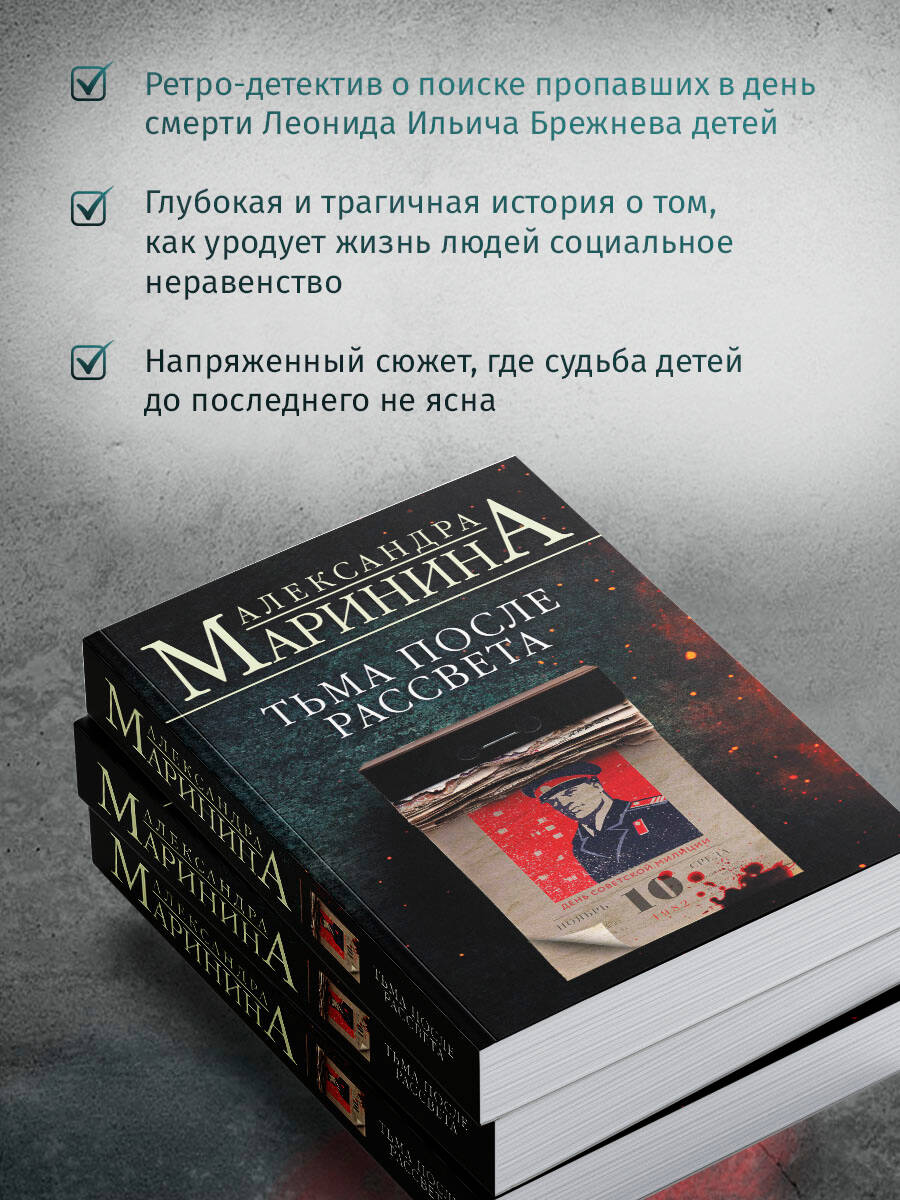Даже если рассвет наступит, то ему на смену снова придет тьма… Ноябрь 1982 года. Годовщина свадьбы супругов Смелянских омрачена смертью Леонида Брежнева. Новый генсек - большой стресс для людей, которым есть что терять. А Смелянские и их гости как раз из таких - настоящая номенклатурная элита. Но это еще не самое страшное. Вечером их тринадцатилетний сын Сережа и дочь подруги Алена ушли в кинотеатр и не вернулись… После звонка «с самого верха» к поискам пропавших детей подключают майора милиции Виктора Гордеева. От быстрого и, главное, положительного результата зависит его перевод на должность замначальника «убойного» отдела. Но какие тут могут быть гарантии? А если они уже мертвы? Тем более, в стране орудует маньяк, убивающий подростков 13-16 лет. И друг Гордеева - сотрудник уголовного розыска Леонид Череменин - предполагает худшее. Впрочем, у его приемной дочери - недавней выпускницы юрфака МГУ Насти Каменской - иное мнение: пропавшие дети не вписываются в почерк серийного убийцы. Опера начинают отрабатывать все возможные версии. А потом к расследованию подключаются сотрудники КГБ… Первый ретро-детектив Александры Марининой. Удивительно точная атмосфера позднего СССР, настроения людей, их страхи и надежды. Уголовники, сотрудники милиции и КГБ, простые граждане и те, кто был допущен к «социалистической кормушке», - у каждого из них своя история и свои мотивы.| Издательство | ООО "Издательство "Эксмо" |