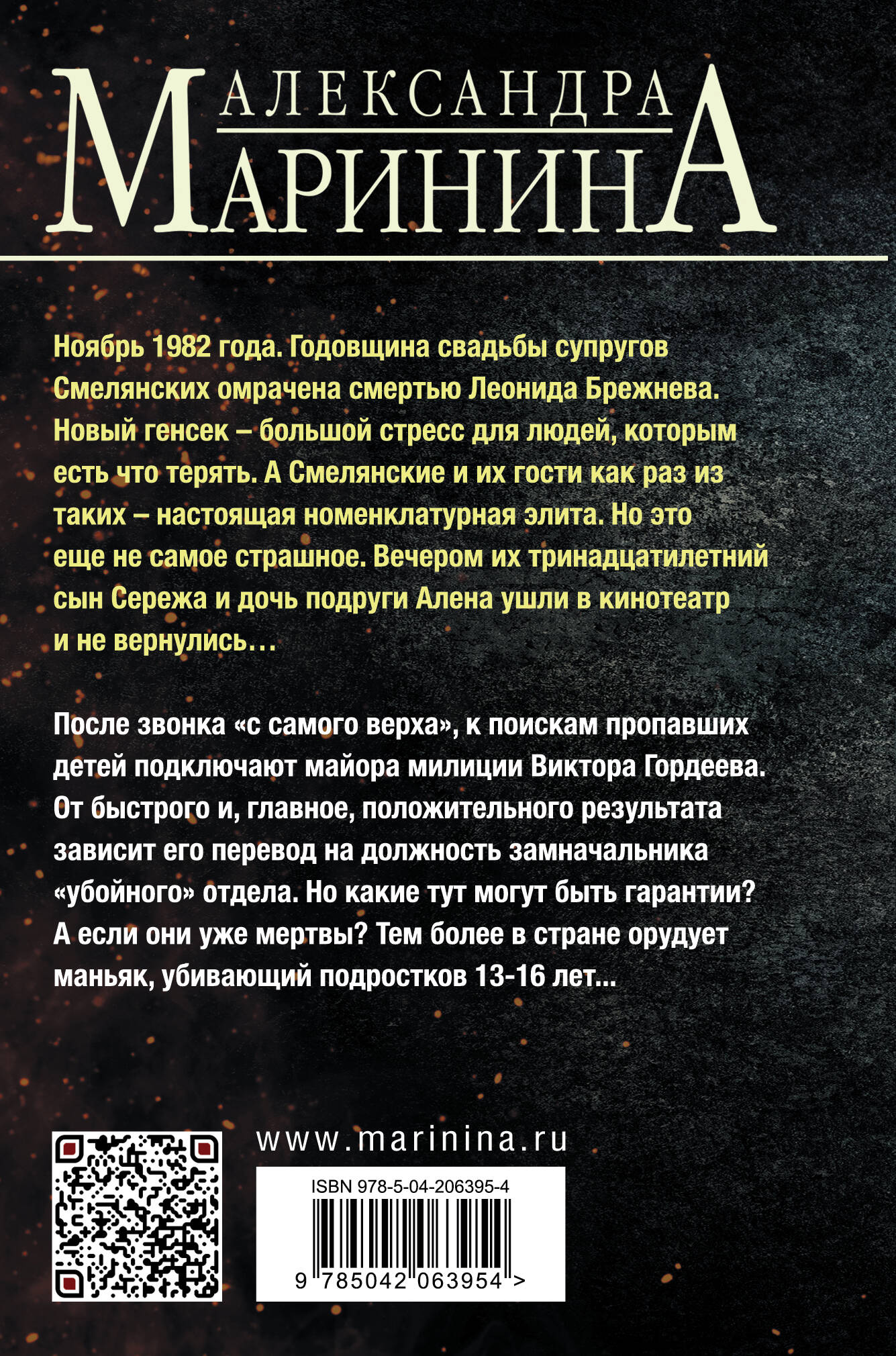 Даже если рассвет наступит, то ему на смену снова придет тьма… Ноябрь 1982 года. Годовщина свадьбы супругов Смелянских омрачена смертью Леонида Брежнева. Новый генсек - большой стресс для людей, которым есть что терять. А Смелянские и их гости как раз из таких - настоящая номенклатурная элита. Но это еще не самое страшное. Вечером их тринадцатилетний сын Сережа и дочь подруги Алена ушли в кинотеатр и не вернулись… После звонка «с самого верха» к поискам пропавших детей подключают майора милиции Виктора Гордеева. От быстрого и, главное, положительного результата зависит его перевод на должность замначальника «убойного» отдела. Но какие тут могут быть гарантии? А если они уже мертвы? Тем более, в стране орудует маньяк, убивающий подростков 13-16 лет. И друг Гордеева - сотрудник уголовного розыска Леонид Череменин - предполагает худшее. Впрочем, у его приемной дочери - недавней выпускницы юрфака МГУ Насти Каменской - иное мнение: пропавшие дети не вписываются в почерк серийного убийцы. Опера начинают отрабатывать все возможные версии. А потом к расследованию подключаются сотрудники КГБ… Первый ретро-детектив Александры Марининой. Удивительно точная атмосфера позднего СССР, настроения людей, их страхи и надежды. Уголовники, сотрудники милиции и КГБ, простые граждане и те, кто был допущен к «социалистической кормушке», - у каждого из них своя история и свои мотивы.
