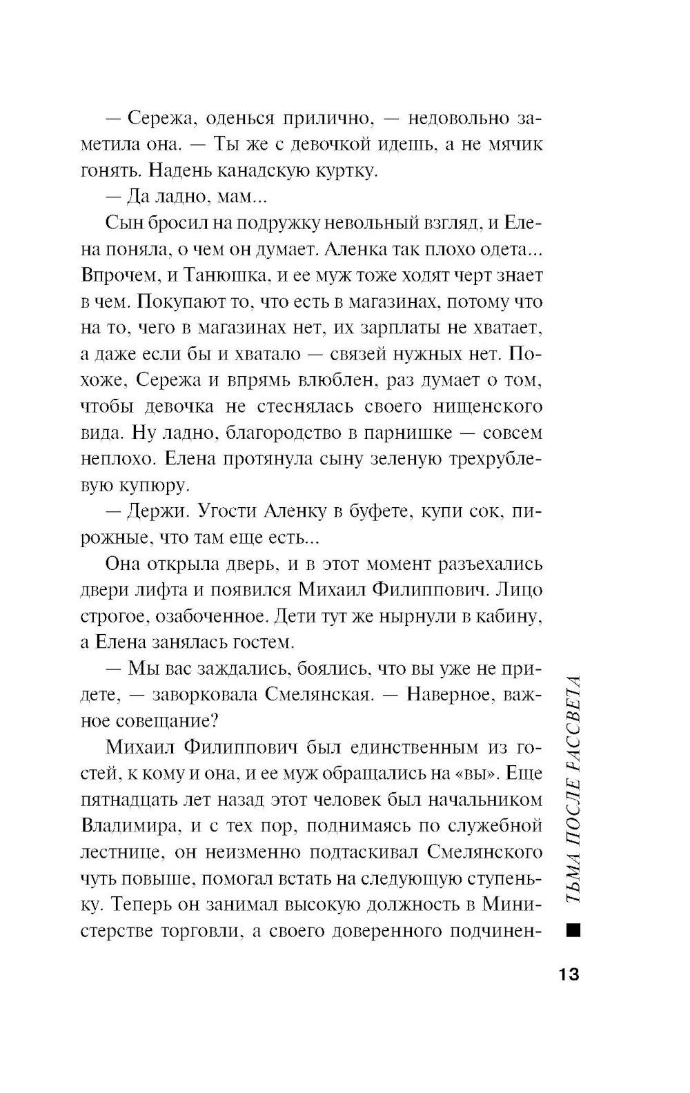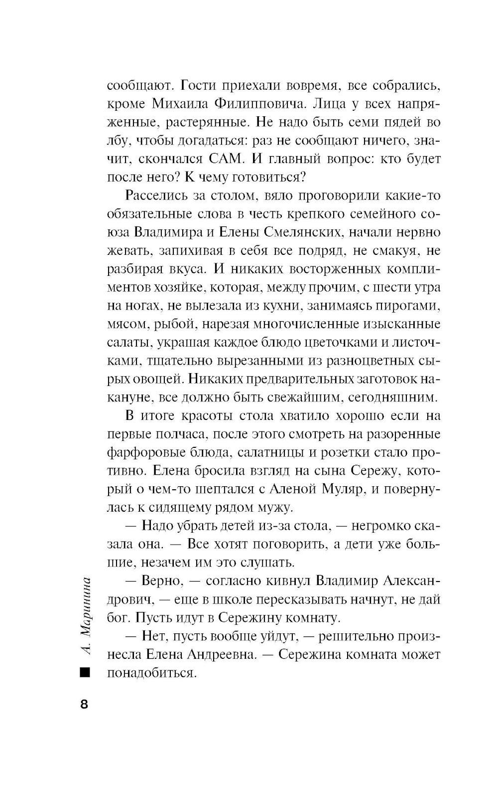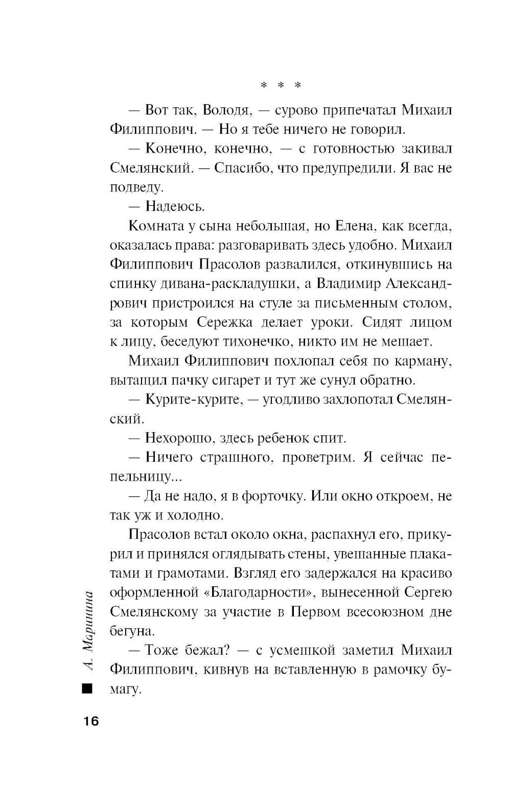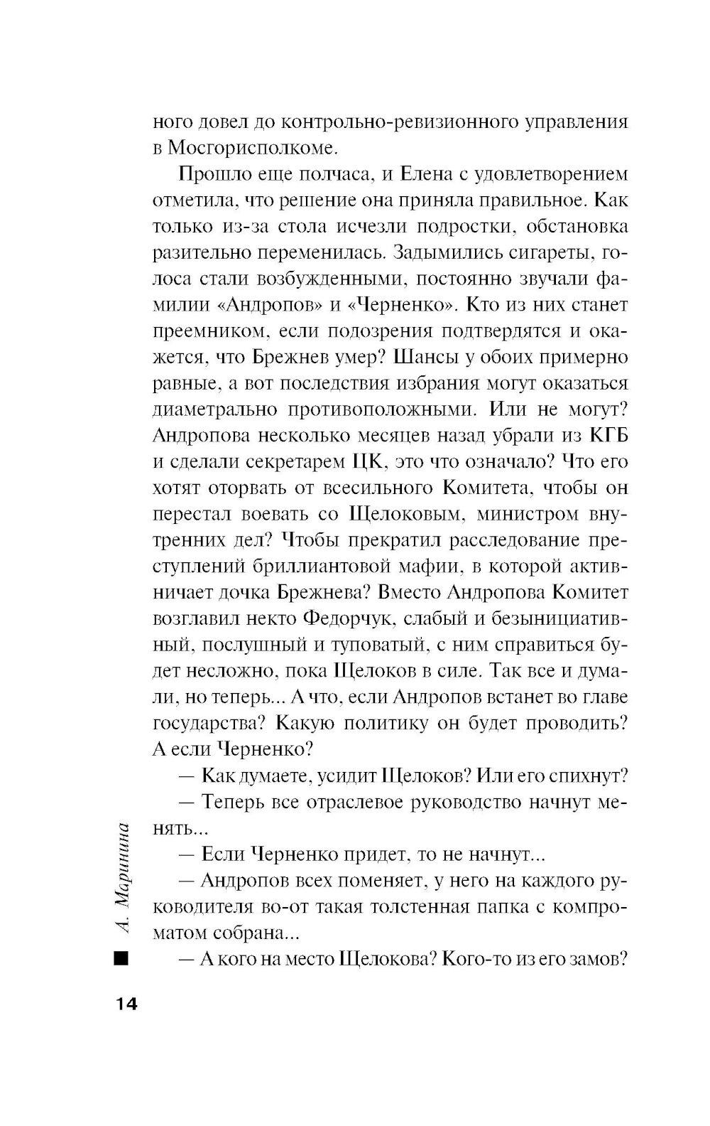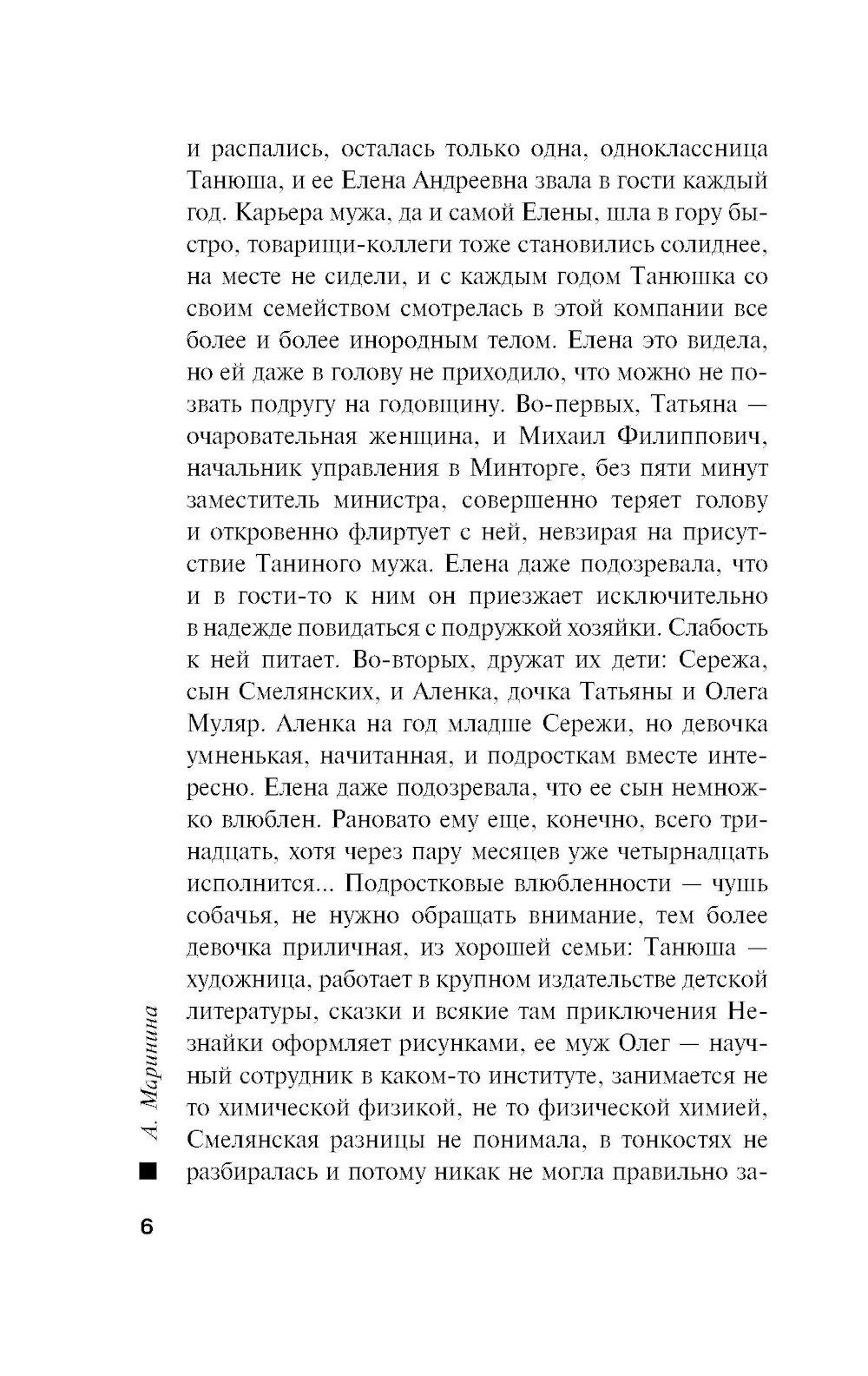 Ноябрь 1982 года. Годовщина свадьбы супругов Смелянских омрачена смертью Леонида Брежнева. Новый генсек - большой стресс для людей, которым есть что терять. А Смелянские и их гости как раз из таких - настоящая номенклатурная элита. Но это еще не самое страшное. Вечером их тринадцатилетний сын Сережа и дочь подруги Алена ушли в кинотеатр и не вернулись... После звонка «с самого верха» к поискам пропавших детей подключают майора милиции Виктора Гордеева. От быстрого и, главное, положительного результата зависит его перевод на должность замначальника «убойного» отдела. Но какие тут могут быть гарантии? А если они уже мертвы? Тем более что в стране орудует маньяк, убивающий подростков 13-16 лет. И друг Гордеева - сотрудник уголовного розыска Леонид Череменин - предполагает худшее. Впрочем, у его приемной дочери - недавней выпускницы юрфака МГУ Насти Каменской - иное мнение: пропавшие дети не вписываются в почерк серийного убийцы. Опера начинают отрабатывать все возможные версии. А потом к расследованию подключаются сотрудники КГБ...| Издательство | Эксмо |