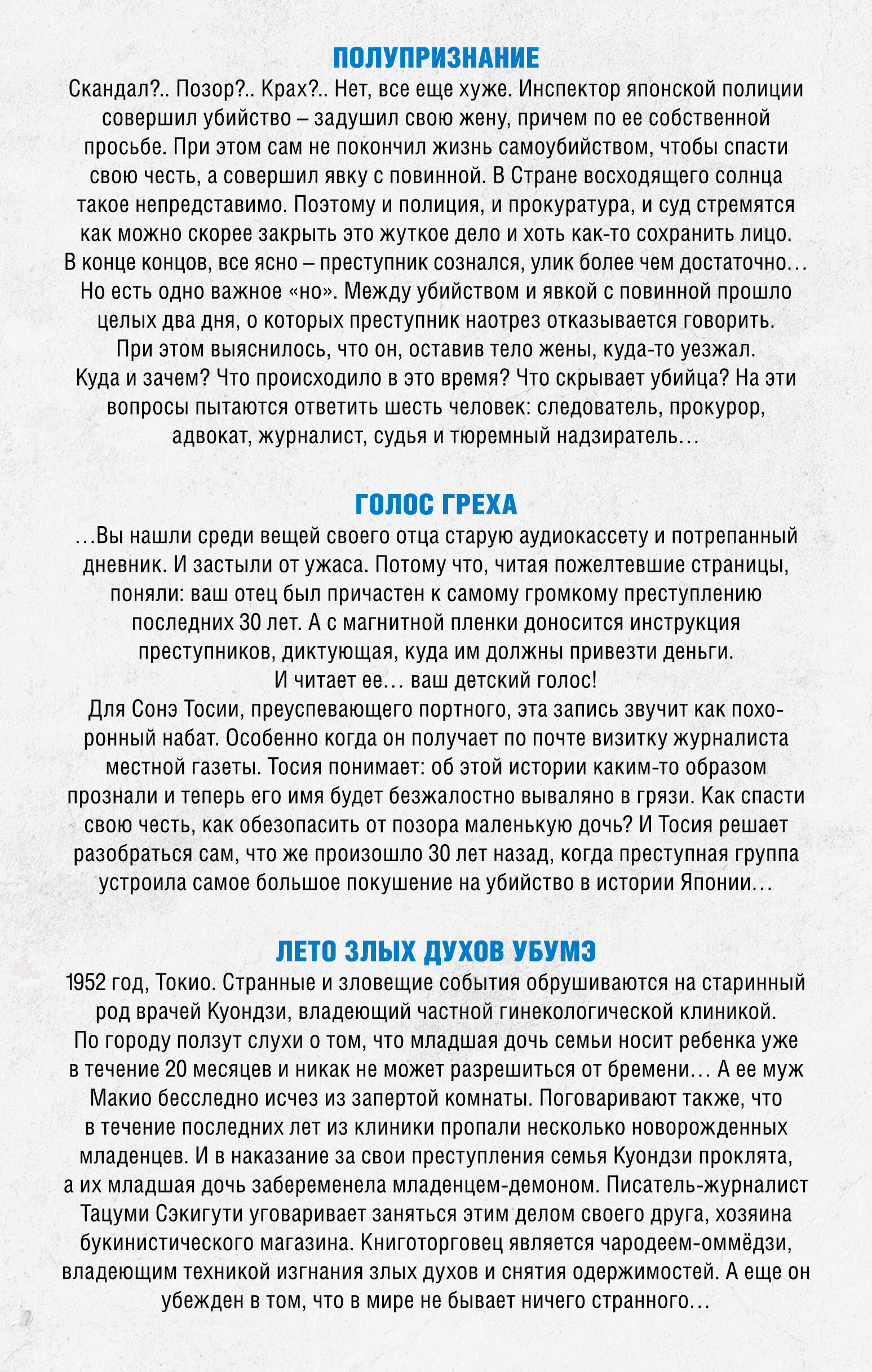 Комплект из 3-х книг, в котором собраны одни из самых знаковых романов современного японского детектива: "Полупризнание", "Голос греха", "Лето злых духов Убумэ". Полупризнание Скандал?.. Позор?.. Крах?.. Нет, все еще хуже. Инспектор японской полиции совершил убийство - задушил свою жену, причем по ее собственной просьбе. При этом сам не покончил жизнь самоубийством, чтобы спасти свою честь, а совершил явку с повинной. В Стране восходящего солнца такое непредставимо. Поэтому и полиция, и прокуратура, и суд стремятся как можно скорее закрыть это жуткое дело и хоть как-то сохранить лицо. В конце концов, все ясно - преступник сознался, улик более чем достаточно… Но есть одно важное «но». Между убийством и явкой с повинной прошло целых два дня, о которых преступник наотрез отказывается говорить. При это выяснилось, что он, оставив тело жены, куда-то уезжал. Куда и зачем? Что происходило в это время? Что скрывает убийца? На эти вопросы пытаются ответить шесть человек: следователь, прокурор, адвокат, журналист, судья и тюремный надзиратель… Голос греха …Вы нашли среди вещей своего отца старую аудиокассету и потрепанный дневник. И застыли от ужаса. Потому что, читая пожелтевшие страницы, поняли: ваш отец был причастен к самому громкому преступлению последних 30 лет. А с магнитной пленки доносится инструкция преступников, диктующая, куда им должны привезти деньги. И читает ее… ваш детский голос! Для Сонэ Тосии, преуспевающего портного, эта запись звучит как похоронный набат. Особенно когда он получает по почте визитку журналиста местной газеты. Тосия понимает: об этой истории каким-то образом прознали, и теперь его имя будет безжалостно вываляно в грязи. Как спасти свою честь, как обезопасить от позора маленькую дочь? И Тосия решает разобраться сам, что же произошло 30 лет назад, когда преступная группа устроила самое большое покушение на убийство в истории Японии… Лето злых духов Убумэ 1952 год, Токио. Странные и зловещие события обрушиваются на старинный род врачей Куондзи, владеющий частной гинекологической клиникой. По городу ползут слухи о том, что младшая дочь семьи носит ребенка уже в течение 20 месяцев и никак не может разрешиться от бремени… А ее муж Макио бесследно исчез из запертой комнаты. Поговаривают также, что в течение последних лет из клиники пропали несколько новорожденных младенцев. И в наказание за свои преступления семья Куондзи проклята, а их младшая дочь забеременела младенцем-демоном. Писатель-журналист Тацуми Сэкигути уговаривает заняться этим делом своего друга, хозяина букинистического магазина. Книготорговец является чародеем-оммёдзи, владеющим техникой изгнания злых духов и снятия одержимостей. А еще он убежден в том, что в мире не бывает ничего странного…| Издательство | ООО "Издательство "Эксмо" |