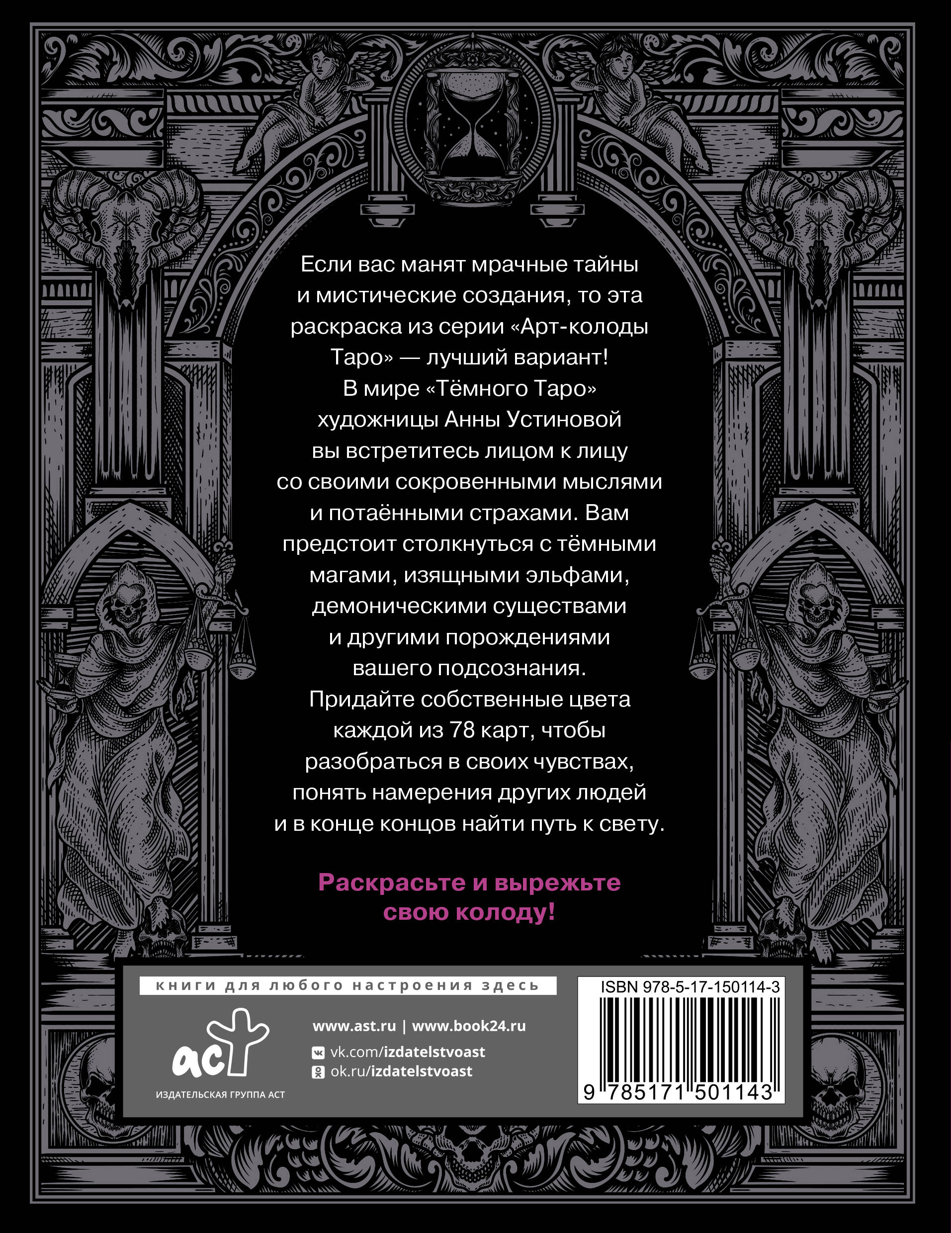Если вас манят мрачные тайны и мистические создания, то эта раскраска из серии "Арт-колоды Таро" - лучший вариант! В мире "Тёмного Таро" художницы Анны Устиновой вы встретитесь лицом к лицу со своими сокровенными мыслями и потаёнными страхами. Вам предстоит столкнуться с тёмными магами, изящными эльфами, демоническими существами и другими порождениями вашего подсознания. Придайте собственные цвета каждой из 78 карт, чтобы разобраться в своих чувствах, понять намерения других людей и в конце концов найти путь к свету. Раскрасьте и вырежьте свою колоду! • 78 контурных иллюстраций карт стандартного размера с рубашками на обороте. • Карты подготовлены специально для раскрашивания и последующего вырезания. • Сверхплотная офсетная бумага подходит для любых художественных материалов - от цветных карандашей и ручек до маркеров. Без просвечивания и отмарывания.| Издательство | ИЗДАТЕЛЬСТВО "АСТ" |