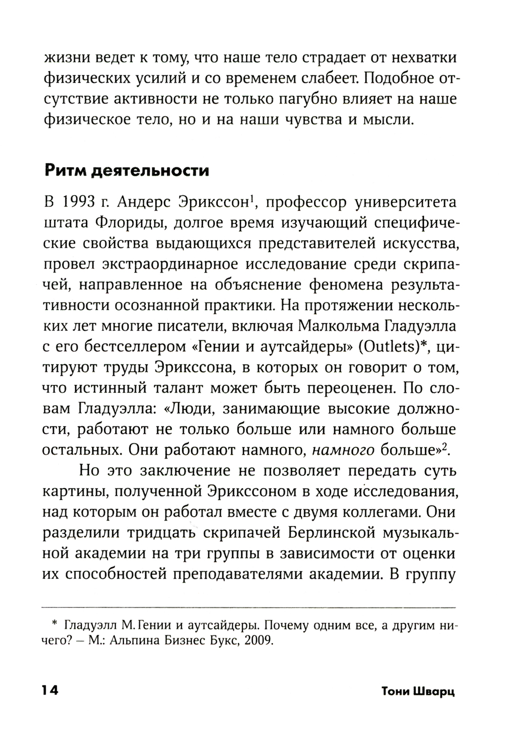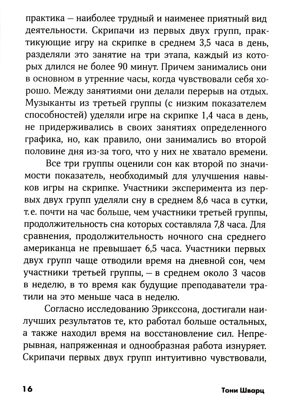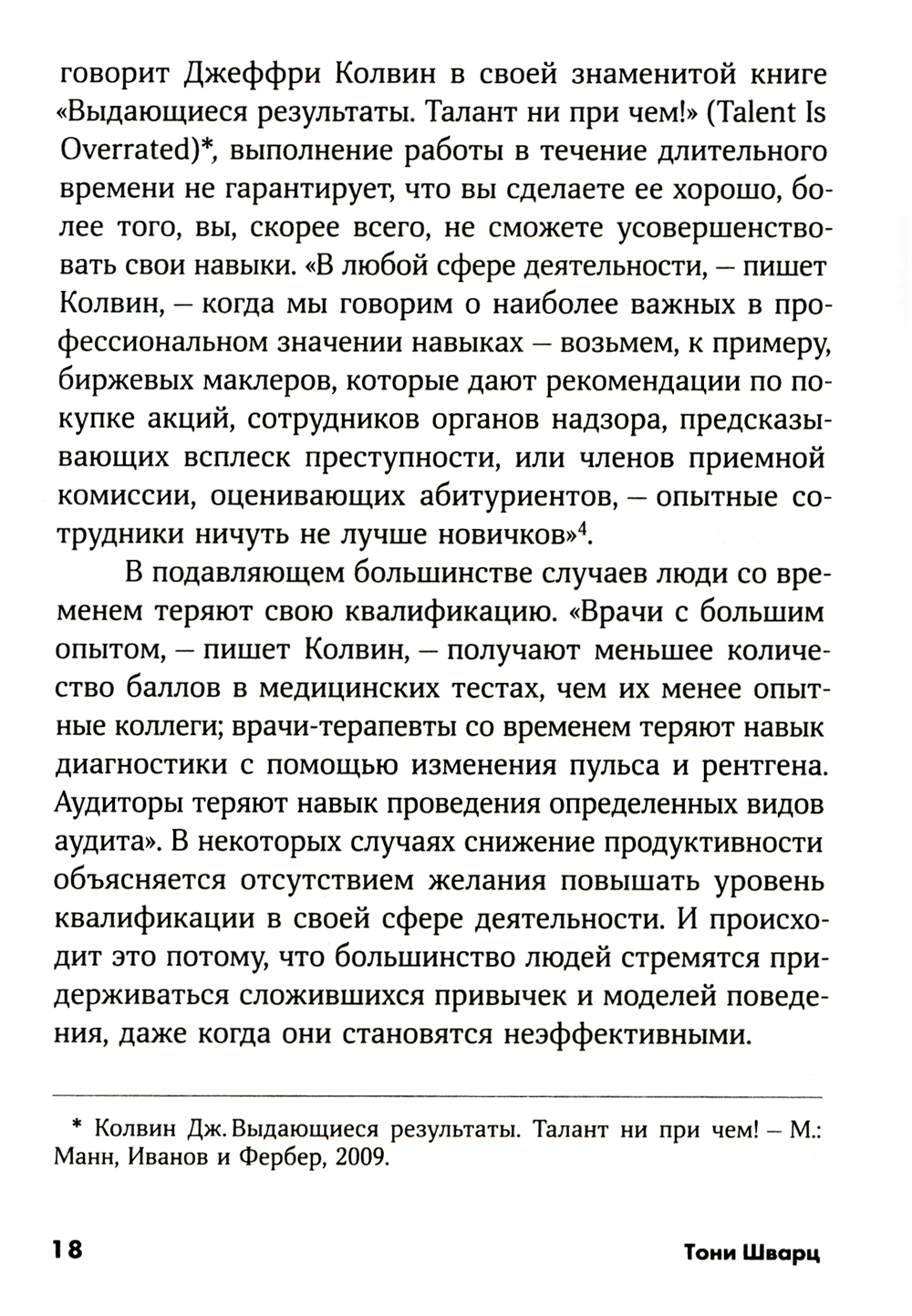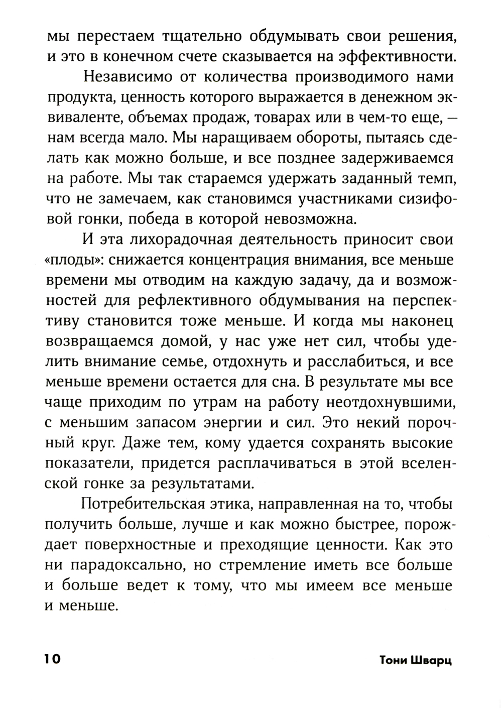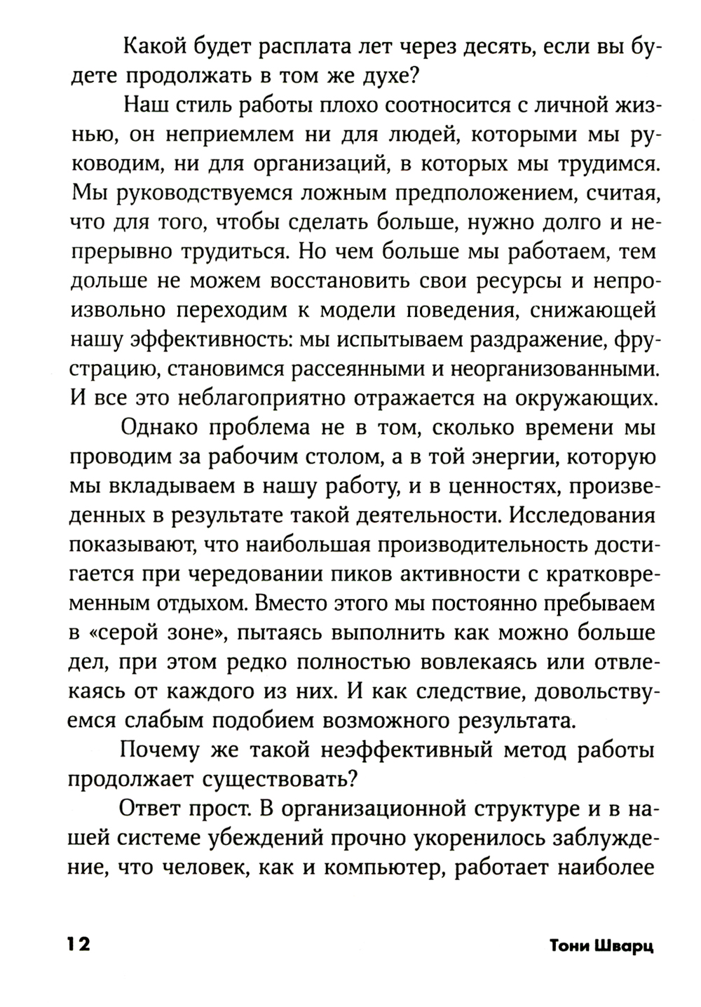 Мы привыкли, что для того, чтобы больше сделать и больше заработать, нужно постоянно наращивать темп, засиживаться в офисе допоздна, работать без выходных и годами не ходить в отпуск. Но постоянный цейтнот и отсутствие отдыха подрывают креативность и снижают реальную производительность. Даже тем, кому удается сохранять высокие показатели, приходится расплачиваться собственным здоровьем в этой вселенской гонке за результатами. Такой изматывающий стиль работы неприемлем ни для людей, ни для организаций. Авторы предлагают оптимальное решение этой проблемы за счет изменений в корпоративной культуре и в управлении жизненной энергией. Предлагаемые ими нововведения, основанные на сочетании труда и отдыха, просты и разумны, они позволяют улучшить жизнь каждого человека и каждой организации и стабильно получать высокие результаты. Книга адресована руководителям и владельцам компаний, специалистам по работе с персоналом, но будет интересна и самой широкой публике.| Издательство | Альпина Паблишер |
