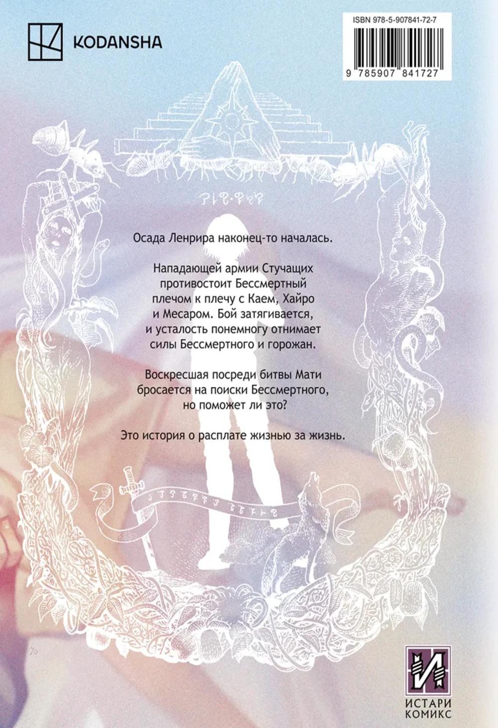 Осада Ленрира наконец-то началась. Нападающей армии Стучащих противостоит Бессмертный плечом к плечу с Каем, Хайро и Месаром. Бой затягивается, и усталость понемногу отнимает силы Бессмертного и горожан. Воскресшая посреди битвы Мати бросается на поиски Бессмертного, но поможет ли это? Это история о расплате жизнью за жизнь.| Издательство | ИД Истари Комикс |