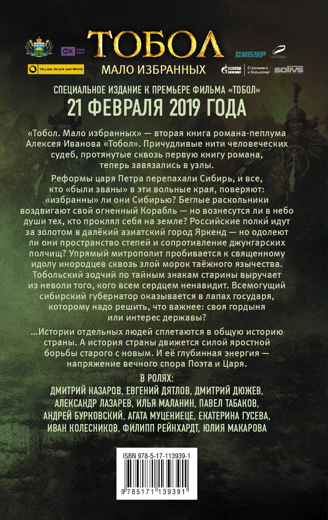 Специальное издание к премьере фильма "Тобол" 21 февраля 2019 года "Тобол. Мало избранных" - вторая книга романа-пеплума Алексея Иванова "Тобол". Причудливые нити человеческих судеб, протянутые сквозь первую книгу романа, теперь завязались в узлы. Реформы царя Петра перепахали Сибирь, и все, кто "были званы" в эти вольные края, поверяют: "избранны" ли они Сибирью? Беглые раскольники воздвигают свой огненный Корабль - но вознесутся ли в небо души тех, кто проклял себя на земле? Российские полки идут за золотом в далёкий азиатский город Яркенд - но одолеют ли они пространство степей и сопротивление джунгарских полчищ? Упрямый митрополит пробивается к священному идолу инородцев через сопротивление таёжных демонов. Тобольский зодчий по тайным знакам старины выручает из неволи того, кого всем сердцем ненавидит. Всемогущий сибирский губернатор оказывается в лапах государя, которому надо решить, что важнее: своя гордыня или интерес державы? …Истории отдельных людей сплетаются в общую историю страны. А история страны движется силой яростной борьбы старого с новым. И её глубинная энергия - напряжение вечного спора Поэта и Царя. В ролях: Дмитрий Назаров, Евгений Дятлов, Дмитрий Дюжев, Александр Лазарев, Илья Маланин, Павел Табаков, Андрей Бурковский, Агата Муцениеце, Екатерина Гусева, Иван Колесников, Филипп Рейнхардт, Юлия Макарова| Издательство | Издательство "АСТ" |