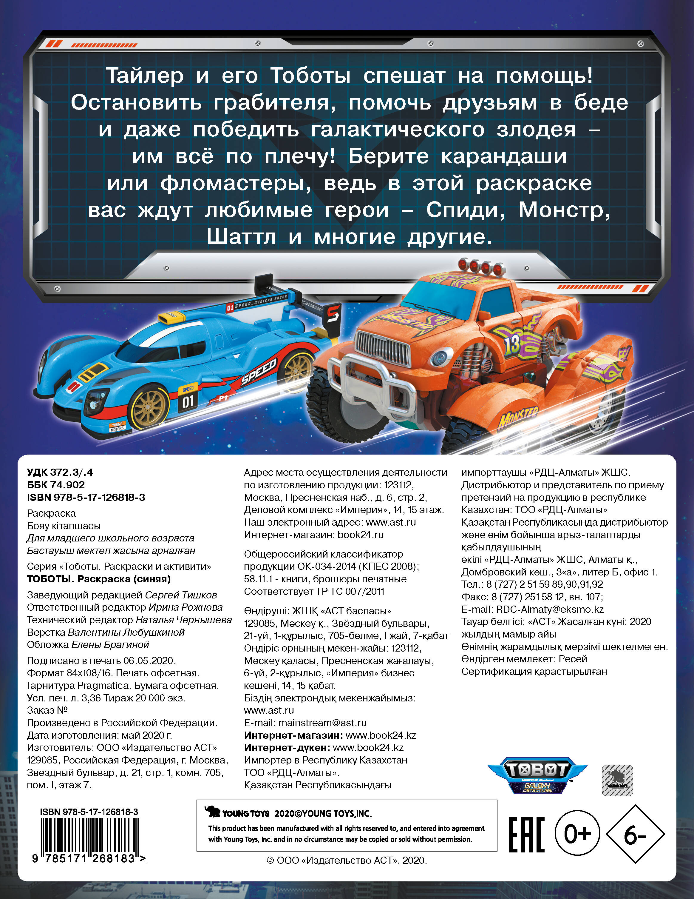 Тайлер и его Тоботы спешат на помощь. Остановить грабителя, помочь друзьям в беде и даже победить галактического злодея - им всё по плечу! Берите карандаши или фломастеры, ведь в этой раскраске вас ждут любимые герои - Спиди, Монстр, Шаттл и многие другие.| Издательство | Издательство "АСТ" |