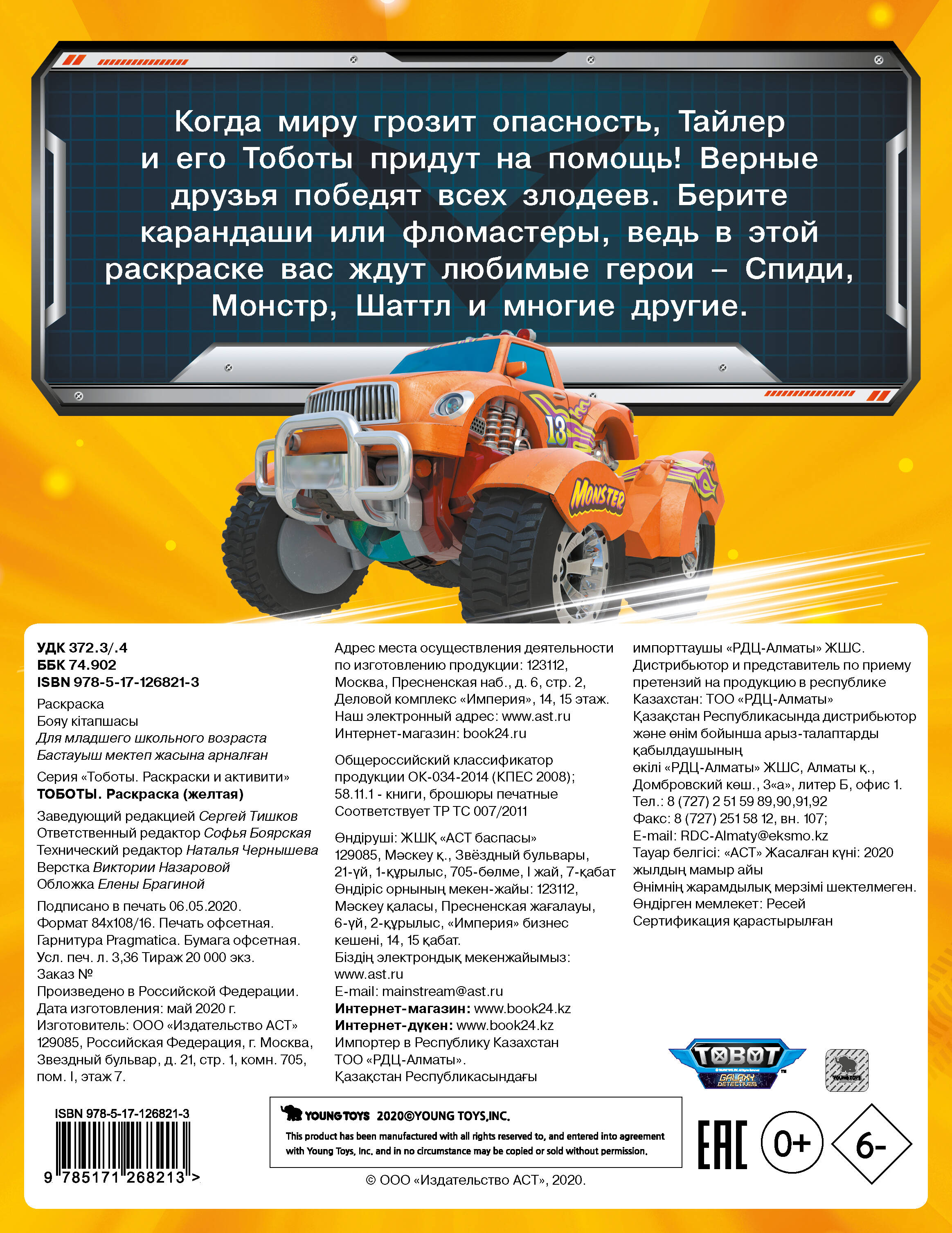 Когда миру грозит опасность, Тайлер и его Тоботы придут на помощь! Верные друзья победят всех злодеев. Берите карандаши или фломастеры, ведь в этой раскраске вас ждут любимые герои - Спиди, Монстр, Шаттл и многие другие.| Издательство | ИЗДАТЕЛЬСТВО "АСТ" |