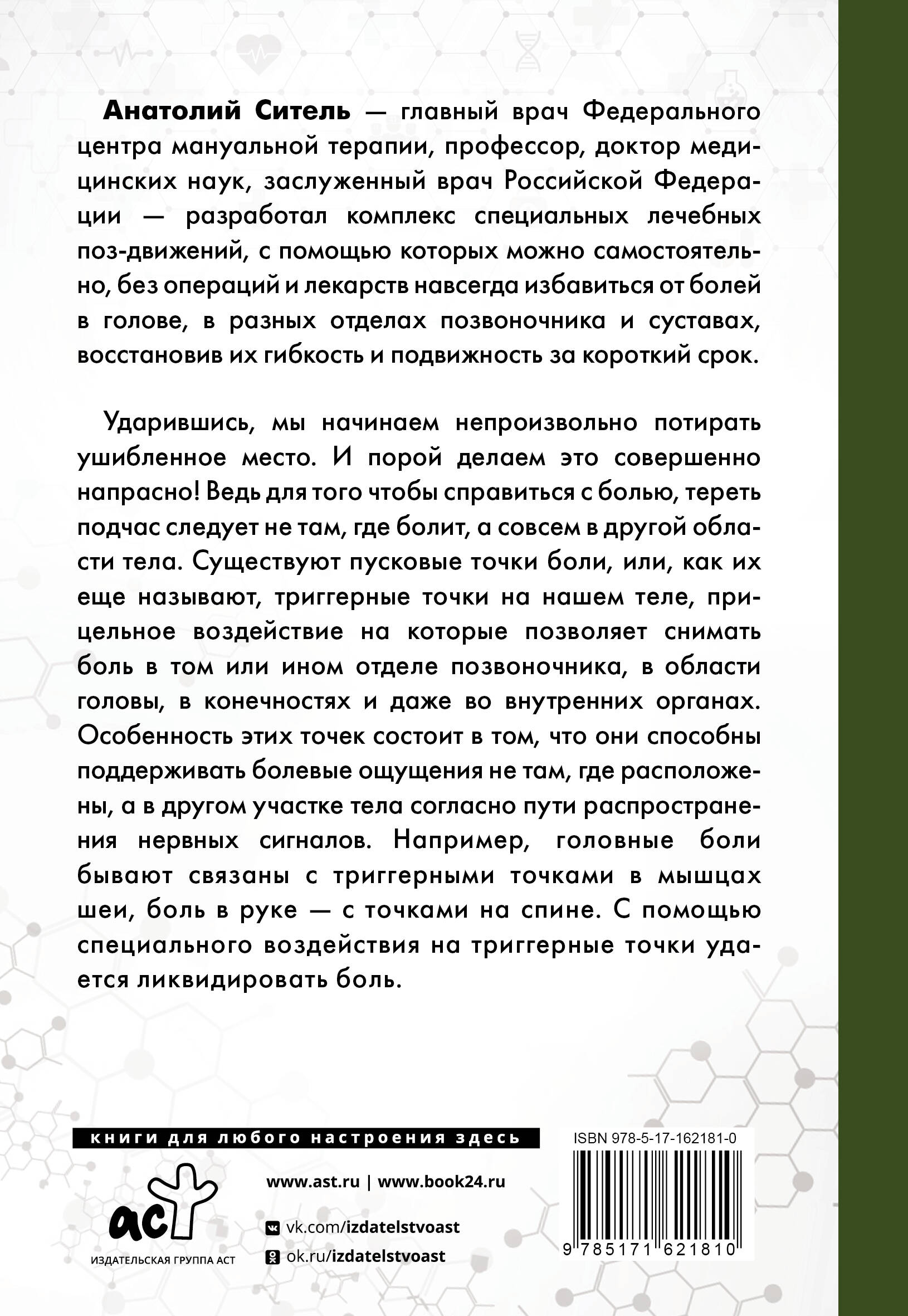 Ударившись, мы начинаем непроизвольно потирать ушибленное место. И порой делаем это совершенно напрасно! Ведь для того чтобы справиться с болью, тереть подчас следует не там, где болит, а совсем в другой области тела. Существуют пусковые точки боли, или, как их еще называют, триггерные точки на нашем теле, прицельное воздействие на которые позволяет снимать боль в том или ином отделе позвоночника, в области головы, в конечностях и даже во внутренних органах. Особенность этих точек состоит в том, что они способны поддерживать болевые ощущения не там, где расположены, а в другом участке тела согласно пути распространения нервных сигналов. Например, головные боли бывают связаны с триггерными точками в мышцах шеи, боль в руке - с точками на спине. С помощью специального воздействия на триггерные точки удается ликвидировать боль.| Издательство | Издательство "АСТ" |