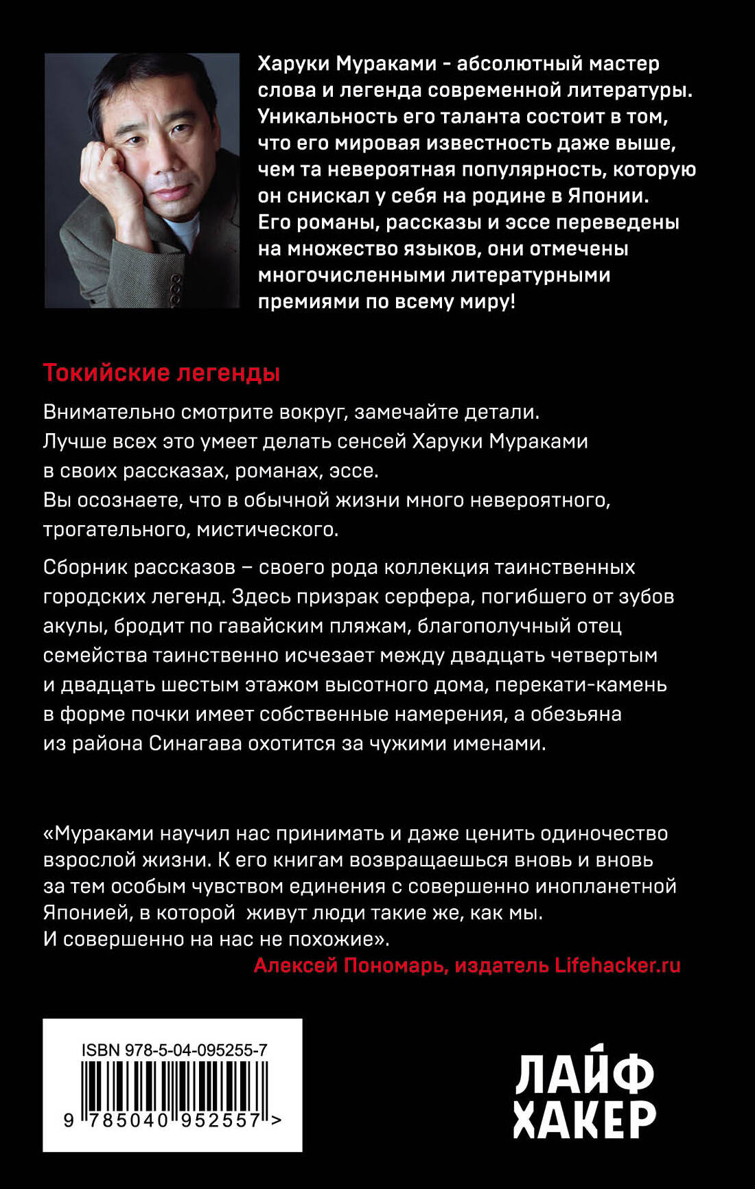 Харуки Мураками - абсолютный мастер слова и легенда современной литературы. Уникальность его таланта состоит в том, что его мировая известность даже выше, чем та невероятная популярность, которую он снискал у себя на родине в Японии. Его романы, рассказы и эссе переведены на множество языков, они отмечены многочисленными литературными премиями по всему миру! Внимательно смотрите вокруг, замечайте детали. Лучше всех это умеет делать сэнсэй Харуки Мураками в своих рассказах, романах, эссе. Вы осознаете, что в обычной жизни много невероятного, трогательного, мистического. Сборник рассказов - своего рода коллекция таинственных городских легенд. Здесь призрак серфера, погибшего от зубов акулы, бродит по гавайским пляжам, благополучный отец семейства таинственно исчезает между двадцать четвертым и двадцать шестым этажами высотного дома, перекати-камень в форме почки имеет собственные намерения, а обезьяна из района Синагава охотится за чужими именами.| Издательство | ООО "Издательство "Эксмо" |