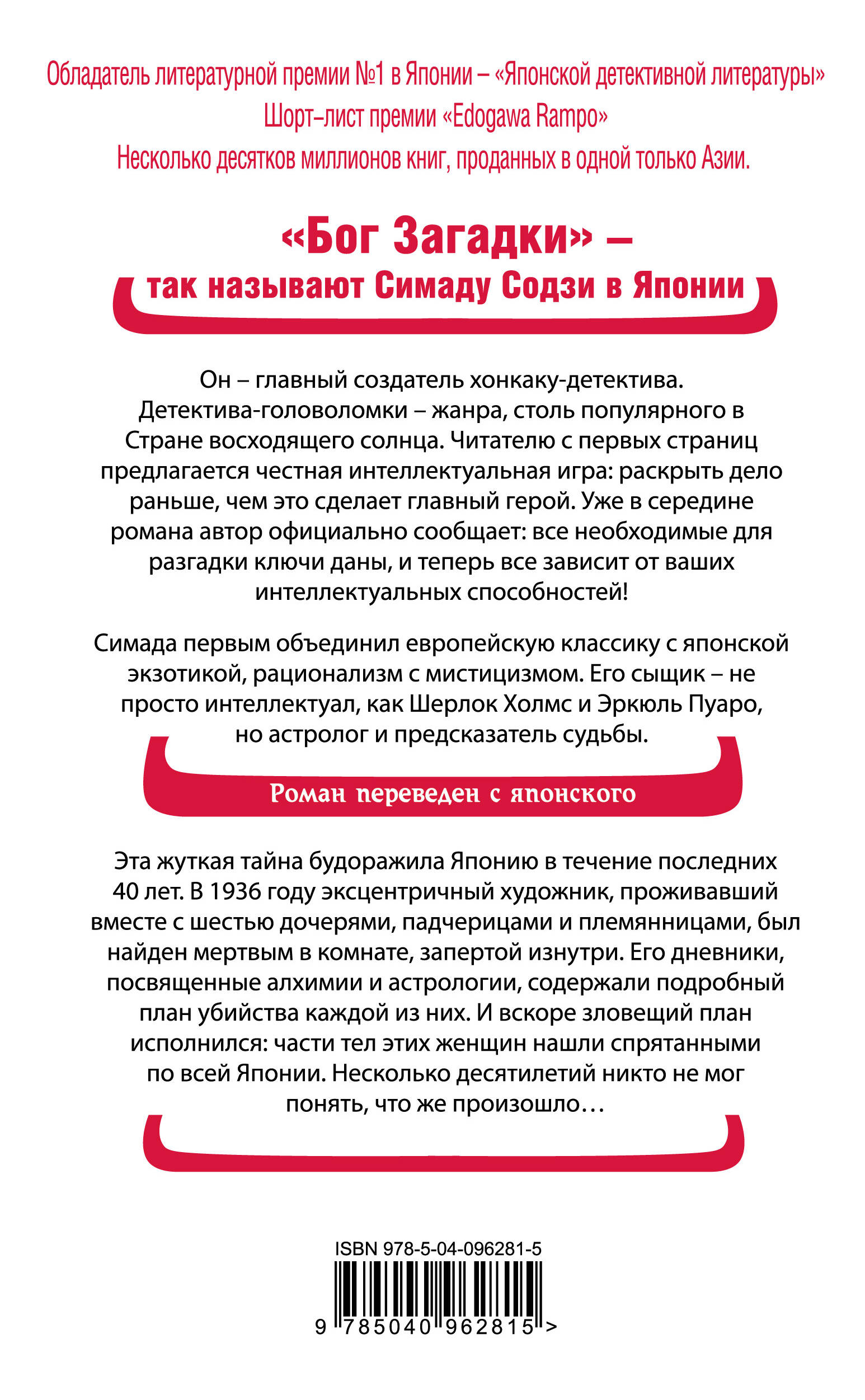 «Бог Загадки» - так называют Симаду Содзи в Японии. Это он создал хонкаку-детектив - новый жанр, столь популярный в Стране Восходящего Солнца. Детектив, в котором читателю предложена честная интеллектуальная игра: раскрыть дело раньше, чем это сделает главный герой. Содзи первым объединил европейскую классику с японской экзотикой, рационализм с мистицизмом. Его великий сыщик - не просто человек острого ума и блестящих аналитических способностей, как Шерлок Холмс, Эркюль Пуаро и Ниро Вульф, но и астролог и предсказатель судьбы. Роман Содзи относится к категории «must read» для каждого уважающего себя японофила - он буквально пропитан интересной информацией об истории, культуре и географии Японии предвоенного периода. ПЕРЕВОД С ЯПОНСКОГО ЯЗЫКА. «Насколько мне известно, это самое странное из когда-либо совершавшихся преступлений. Абсолютно невозможное; ничего подобного, наверное, никогда не случалось не только в Японии, но и во всем мире. Оно было задокументировано со всей тщательностью - остались все записи и протоколы, под рукой, казалось бы, все ключи. Но загадка все равно самым необъяснимым образом не поддавалась. Перед тем как дать на нее ответ, данная книга предоставляет читателям возможность самим додуматься до решения, имея все необходимые для этого сведения». - Кадзуми Исиока, друг и соратник Киёси Митараи - предсказателя судьбы, астролога и великого детектива. «Великий Содзи Симада буквально изобрел целый поджанр "логической загадки"». - The Guardian «Хитроумнейше и захватывающе экзотично». - Japan Times «Одно из самых оригинальных решений загадки, которые я когда-либо встречал». - Энтони Горовиц| Издательство | ООО "Издательство "Эксмо" |