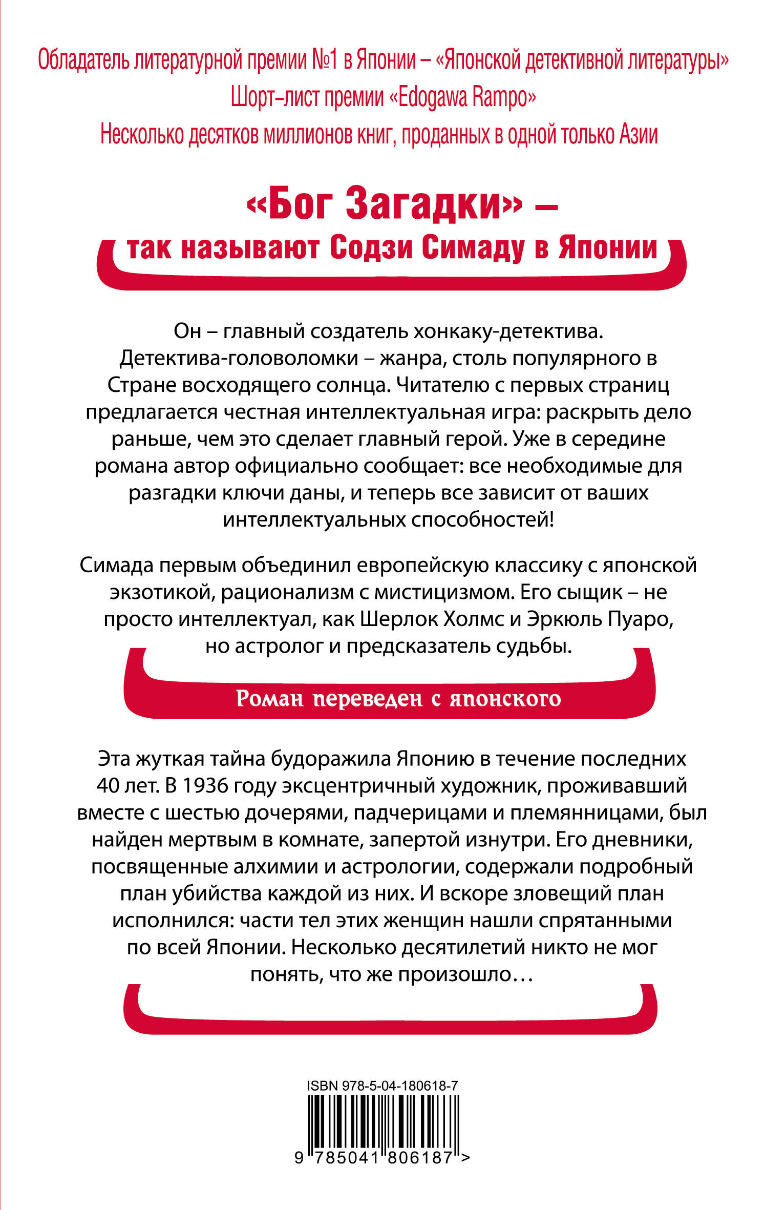 Япония, 1936 год. Эксцентричный художник, проживавший вместе с шестью дочерьми, падчерицами и племянницами, был найден мертвым в комнате, запертой изнутри. Его дневники, посвященные алхимии и астрологии, содержали подробный план убийства каждой из них. Лишить жизни нескольких, чтобы дать жизнь одной, но совершенной - обладательнице самых сильных качеств всех знаков Зодиака. И вскоре после этого план исполнился: части тел этих женщин находят спрятанными по всей Японии. К 1979 году Токийские убийства по Зодиаку будоражили нацию десятилетиями, но так и не были раскрыты. Предсказатель судьбы, астролог и великий детектив Киёси Митараи и его друг-иллюстратор должны за одну неделю разгадать тайну этого невозможного преступления. У вас есть все необходимые ключи, но сможете ли вы найти отгадку прежде, чем это сделают они? «Бог Загадки» - так называют Симаду Содзи в Японии. Это он создал хонкаку-детектив - новый жанр, столь популярный в Стране Восходящего Солнца. Детектив, в котором читателю предложена честная интеллектуальная игра: раскрыть дело раньше, чем это сделает главный герой. Содзи первым объединил европейскую классику с японской экзотикой, рационализм с мистицизмом. Его великий сыщик - не просто человек острого ума и блестящих аналитических способностей, как Шерлок Холмс, Эркюль Пуаро и Ниро Вульф, но и астролог и предсказатель судьбы. Роман Содзи относится к категории «must read» для каждого уважающего себя японофила - он буквально пропитан интересной информацией об истории, культуре и географии Японии предвоенного периода. ПЕРЕВОД С ЯПОНСКОГО ЯЗЫКА. «Насколько мне известно, это самое странное из когда-либо совершавшихся преступлений. Абсолютно невозможное; ничего подобного, наверное, никогда не случалось не только в Японии, но и во всем мире. Оно было задокументировано со всей тщательностью - остались все записи и протоколы, под рукой, казалось бы, все ключи. Но загадка все равно самым необъяснимым образом не поддавалась. Перед тем как дать на нее ответ, данная книга предоставляет читателям возможность самим додуматься до решения, имея все необходимые для этого сведения». - Кадзуми Исиока, друг и соратник Киёси Митараи - предсказателя судьбы, астролога и великого детектива «Великий Содзи Симада буквально изобрел целый поджанр "логической загадки"». - The Guardian «Хитроумнейше и захватывающе экзотично». - Japan Times «Одно из самых оригинальных решений загадки, которые я когда-либо встречал». - Энтони Горовиц| Издательство | ООО "Издательство "Эксмо" |