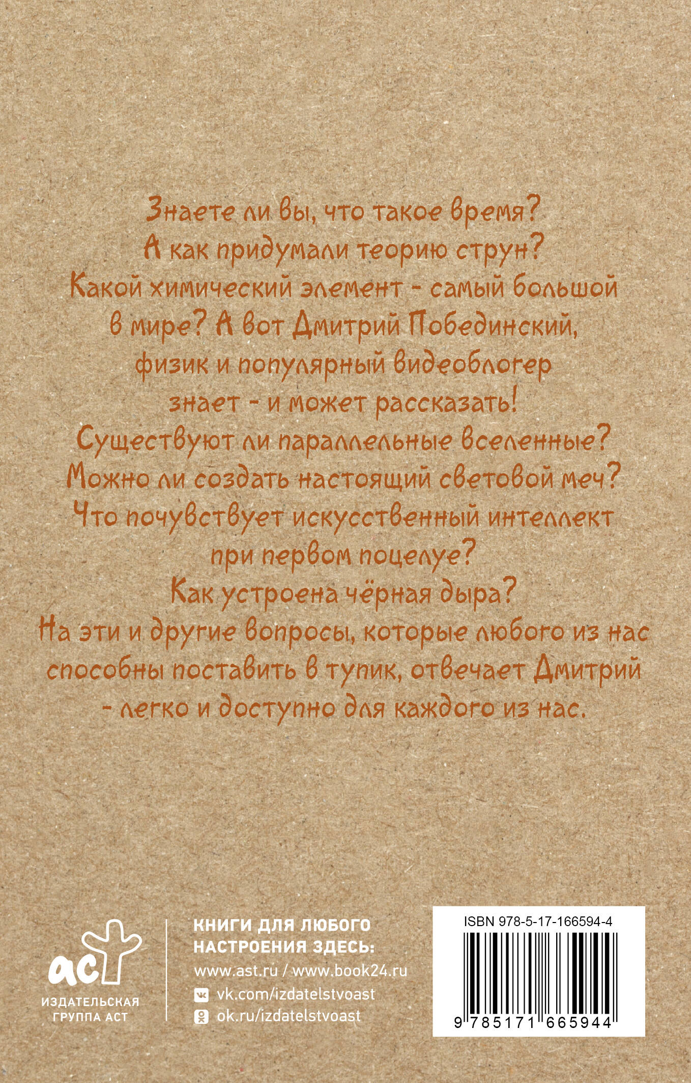 Знаете ли вы, что такое время? А как придумали теорию струн? Какой химический элемент - самый большой в мире? А вот Дмитрий Побединский, физик и популярный видеоблогер знает - и может рассказать! Существуют ли параллельные вселенные? Можно ли создать настоящий световой меч? Что почувствует искусственный интеллект при первом поцелуе? Как устроена чёрная дыра? На эти и другие вопросы, которые любого из нас способны поставить в тупик, отвечает Дмитрий - легко и доступно для каждого из нас.| Издательство | Издательство "АСТ" |