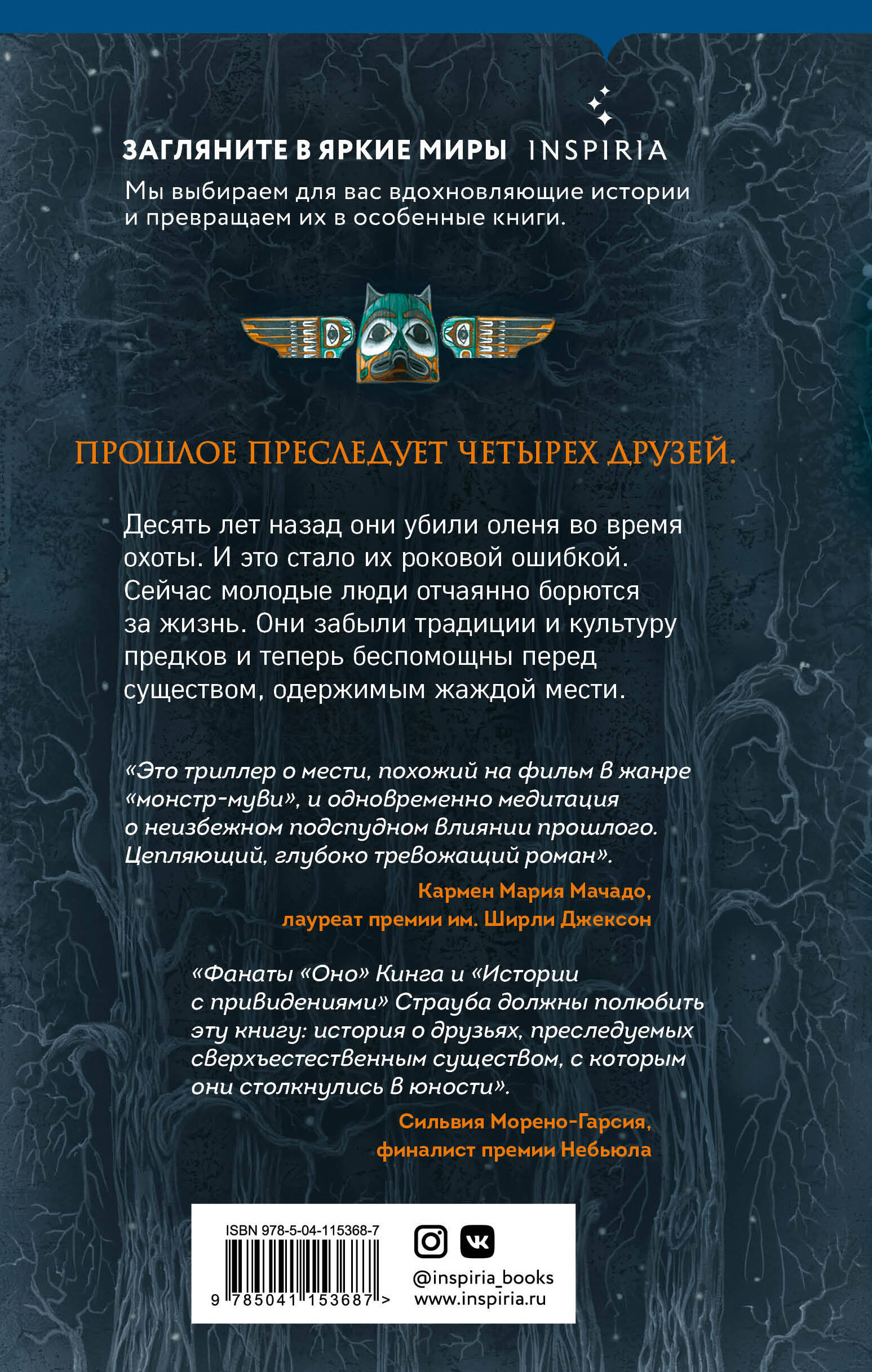Четыре друга детства встречаются каждый год и едут вместе поохотиться на оленей. Однажды что-то идет не так. Убит не тот олень, но молодые люди об этом не догадываются. Они не знают наследия своих предков, а культуру племени вообще ни во что не ставят. Спустя десять лет их настигает сверхъестественное существо, чья месть станет воистину легендарной. «Фанаты "Оно" Кинга и "Истории с привидениями" Страуба должны полюбить эту книгу: история о друзьях, преследуемых сверхъестественным существом, с которым они столкнулись в юности». - Сильвия Морено-Гарсия «Джонс смело включает в роман как темную сторону, так и красоту современной жизни индейцев, причем не впадает в стереотипы и не ищет легкие ответы. Он не уклоняется от ужаса, который следует за насилием». - Ребекка Роанхорс «Это триллер о мести, похожий на фильм в жанре "монстр-муви" и одновременно медитация о неизбежном подспудном влиянии прошлого. Цепляющий, глубоко тревожащий роман». - Кармен Мария Мачадо, лауреат премии им. Ширли Джексон «Эмоциональная глубина потрясает… чувство вины, потеря идентичности, своего места в мире и моральных ориентиров. В романе есть все - стиль, эйфория, реализм, фантастика, отмщение, тепло, леденящий холод и немного жестокости. Другими словами, книга состоит из всего, что мы хотим исследовать вместе с автором». - Джош Маллерман «"Только хорошие индейцы" - страшно как хороши. Джонс - один из самых талантливых современных писателей. В книге полно юмора и пугающих образов. В ней есть любовь и месть, кровь и баскетбол… Я никогда не смогу смотреть на оленей или охоту по-старому». - Томми Оранж, финалист Пулитцеровской премии «Это самый американский роман ужасов, который я когда-либо читал». - Грейди Хендрикс «Душераздирающе красивая история о надежде и выживании, культурной идентичности, семье и традиции». - Library Journal «Смелый и яркий роман». - The New York Times «Стивен Грэм Джонс - одно из наших ценнейших сокровищ». - Сэм Джей Миллер, лауреат премии «Небьюла» «Как долго мы должны расплачиваться за наши ошибки и грехи? Неужели бездумный поступок обрекает нас на вечное проклятие? Роман, проникнутый интуицией, ужасом, умом и юмором. Это триумф, не просто история, а размышление над историями. Я гадал, кто станет достойным наследником "Истории с привидениями" Питера Страуба. Теперь я знаю ответ: Стивен Грэм Джонс». - Виктор ЛаВаль «Эта книга - произведение искусства. Интимное, опустошительное, брутальное, ужасающее, но в то же время теплое и душераздирающее в лучшем смысле слова. Джонс написал роман о несправедливости и, в конечном счете, о надежде. Не ложная сентиментальная надежда, а истинная, на то, что некоторые из нас выживут и помогут остальным. И это дает мне надежду, что эта книга существует и вы держите ее в своих руках». - Пол Тремблей *В книгах Inspiria, выпущенных в 2020 году, доступен к прослушиванию только пробный фрагмент аудио. В книгах, выпущенных позже 2020 года, мы предоставляем доступ к полной аудиоверсии.| Издательство | ООО "Издательство "Эксмо" |