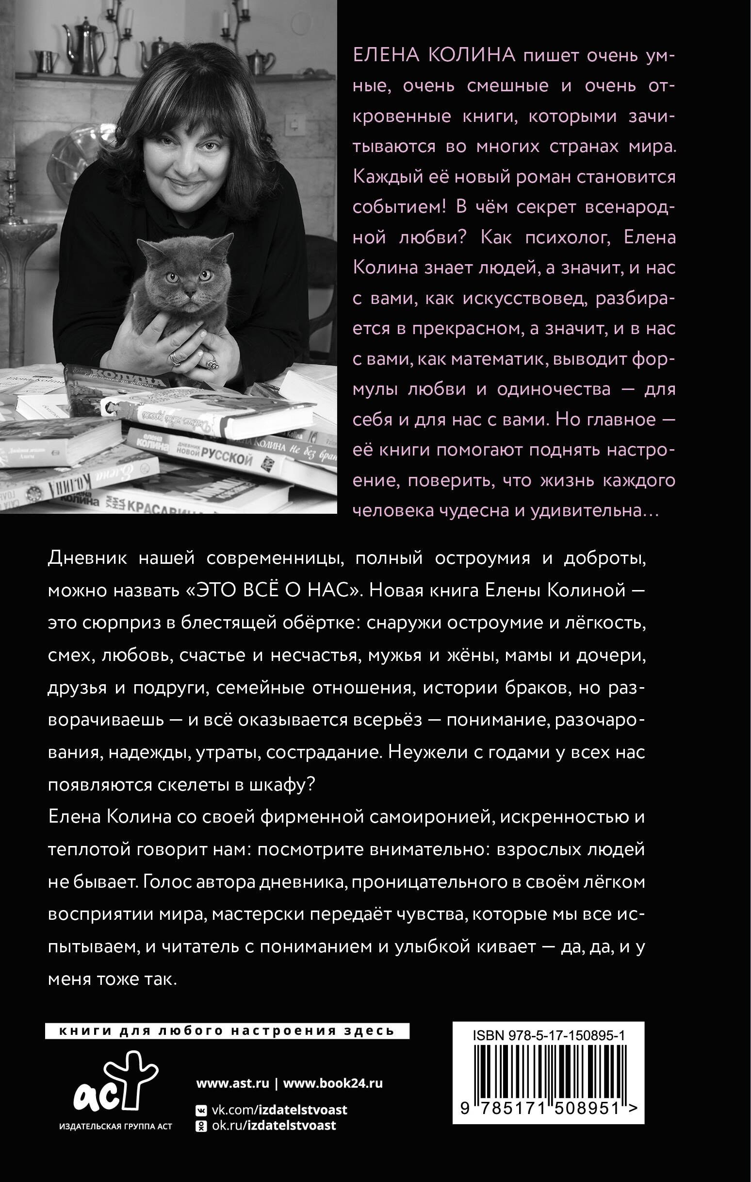 - Продолжение культового «Дневника новой русской» - 20 лет спустя! - Что же произошло с любимыми героинями? Как они изменились: от приключений 35-летних к не менее удивительным переживаниям, осознаниям и приключениям 55-летних. - Остроумный, лёгкий и искренний роман с глубокой психологической начинкой. - Елена Колина - автор тонких и душевных женских романов, психолог и искусствовед. Тираж 25 книг писательницы - более 500 000 экземпляров! - Словесное искусство Елены Колиной - это воздушная линия к пониманию окружающих тебя людей, к чужому знанию жизни.