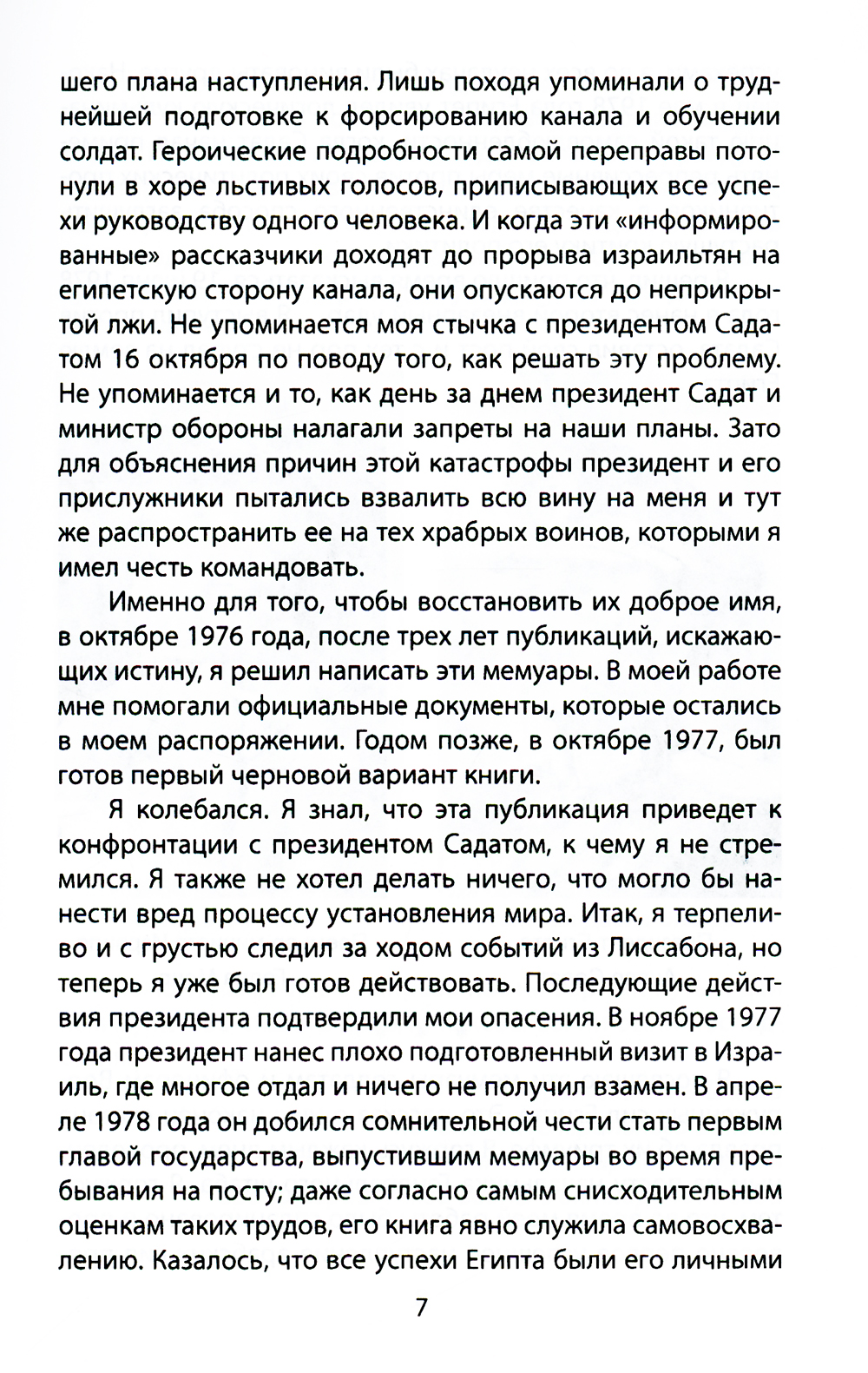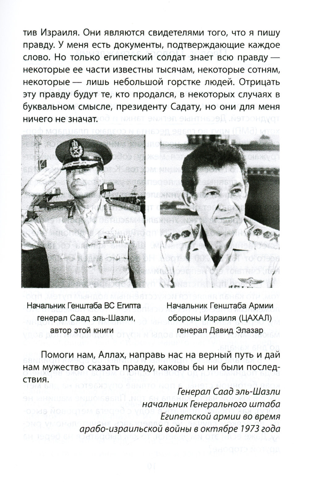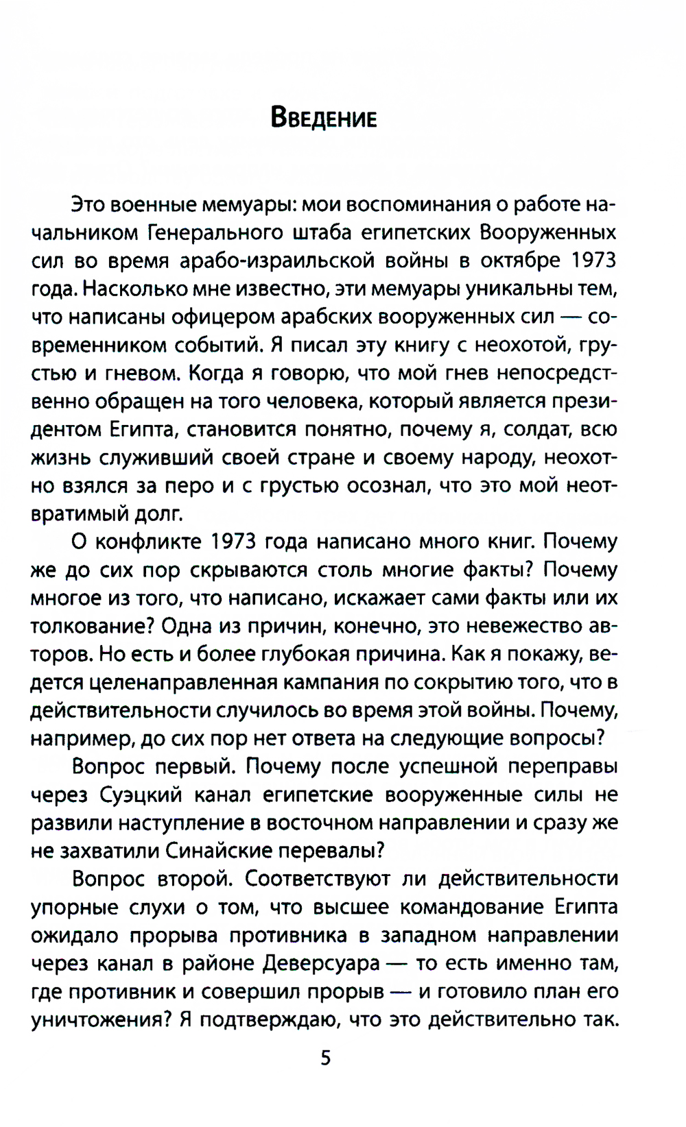 У генерала Саада эль-Шазли безупречный послужной список. Он считается «арабским Маргеловым» - создателем воздушно-десантных войск Египта. Он был командующим Объединенных арабских сил в Конго (1960-1961 г.), военным атташе Египта в Лондоне (1961-1963 г.), командующим войсками специального назначения (1967-1969 г.), командующим округом Красного моря (1970-1971 г.). Венцом его военной карьеры стал пост начальника Генерального штаба вооруженных сил Египта и форсирование Суэцкого канала с последующим захватом некогда неприступной линии Бар-Лева в арабо-израильской войне 1973 года. Этот блестящий результат пошел прахом из-за решения египетского лидера Анвара Садата избавиться от советской военной помощи и воевать самостоятельно. Козлом отпущения был назначен строптивый начальник Генштаба. Книга генерала эль-Шазли раскрывает малоизвестные у нас страницы ближневосточных конфликтов. В ней говорится о роли СССР в строительстве вооруженных сил Египта после «Шестидневной войны» 1967 года, подробно описывается ход так удачно начавшейся новой войны и ее трагическое для Египта завершение.
