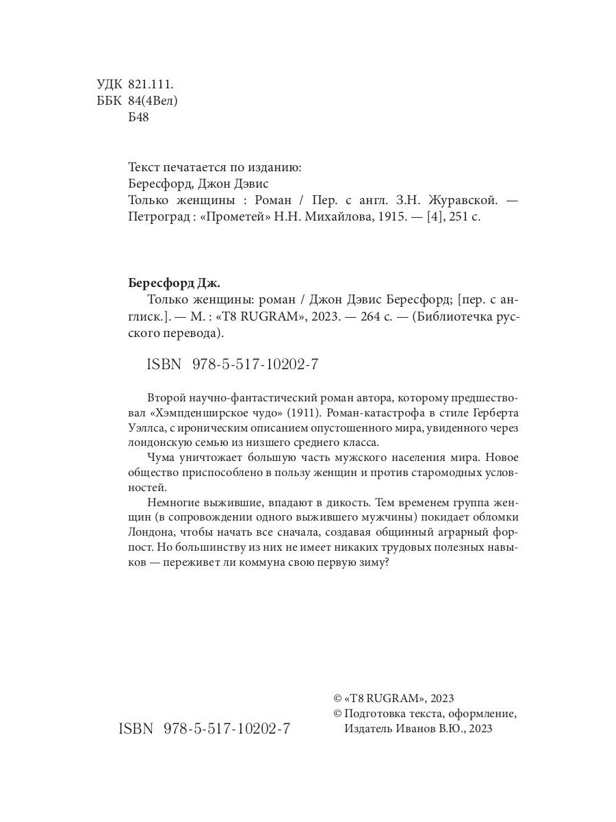 Второй научно-фантастический роман автора, которому предшествовал «Хэмпденширское чудо» (1911). Роман-катастрофа в стиле Герберта Уэллса, с ироническим описанием опустошенного мира, увиденного через лондонскую семью из низшего среднего класса. Чума уничтожает большую часть мужского населения мира. Новое общество приспособлено в пользу женщин и против старомодных условностей. Немногие выжившие впадают в дикость. Тем временем группа женщин (в сопровождении одного выжившего мужчины) покидает обломки Лондона, чтобы начать все сначала, создавая общинный аграрный форпост. Но большинство из них не имеет никаких трудовых полезных навыков - переживет ли коммуна свою первую зиму?| Издательство | Т8 RUGRAM |