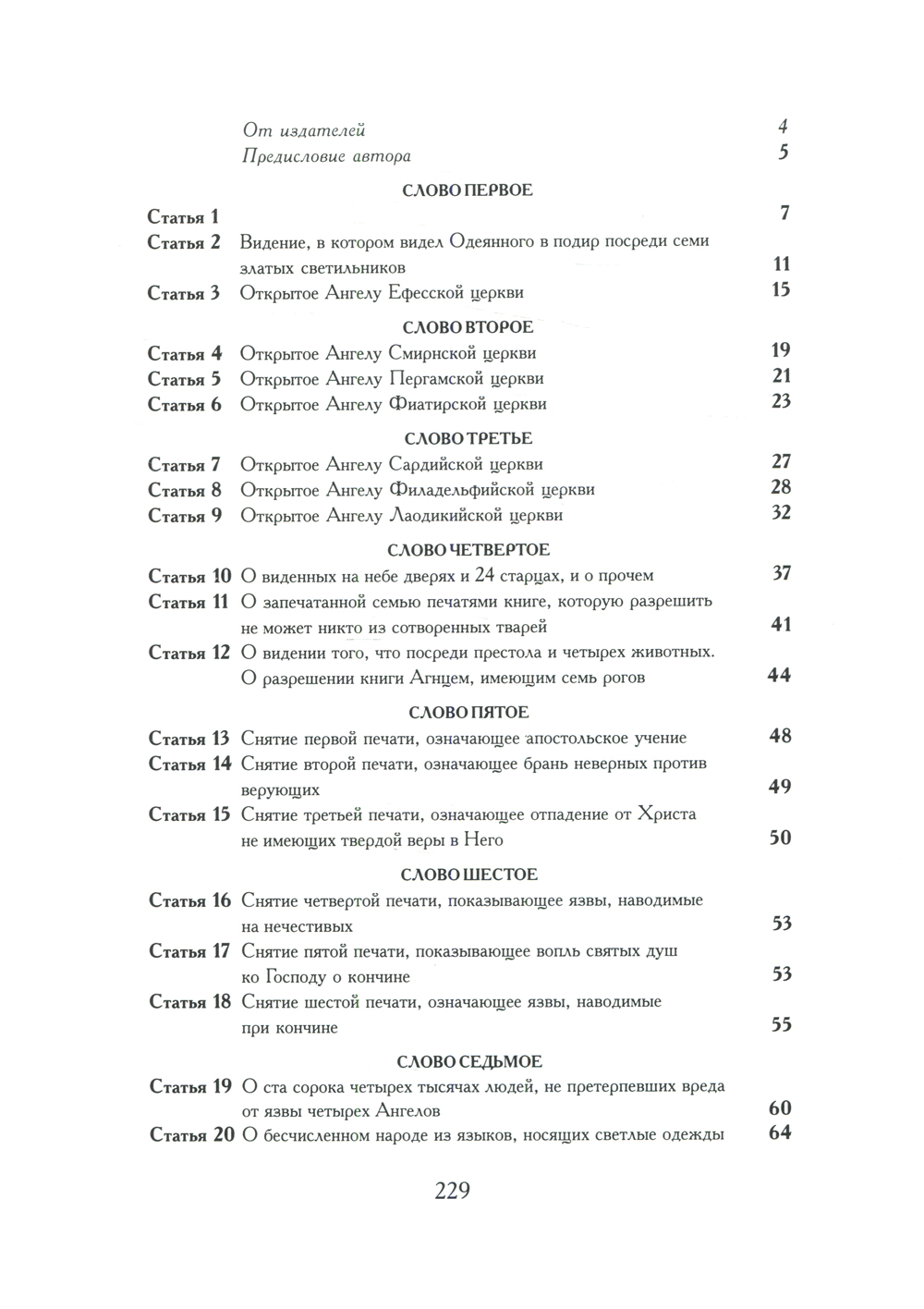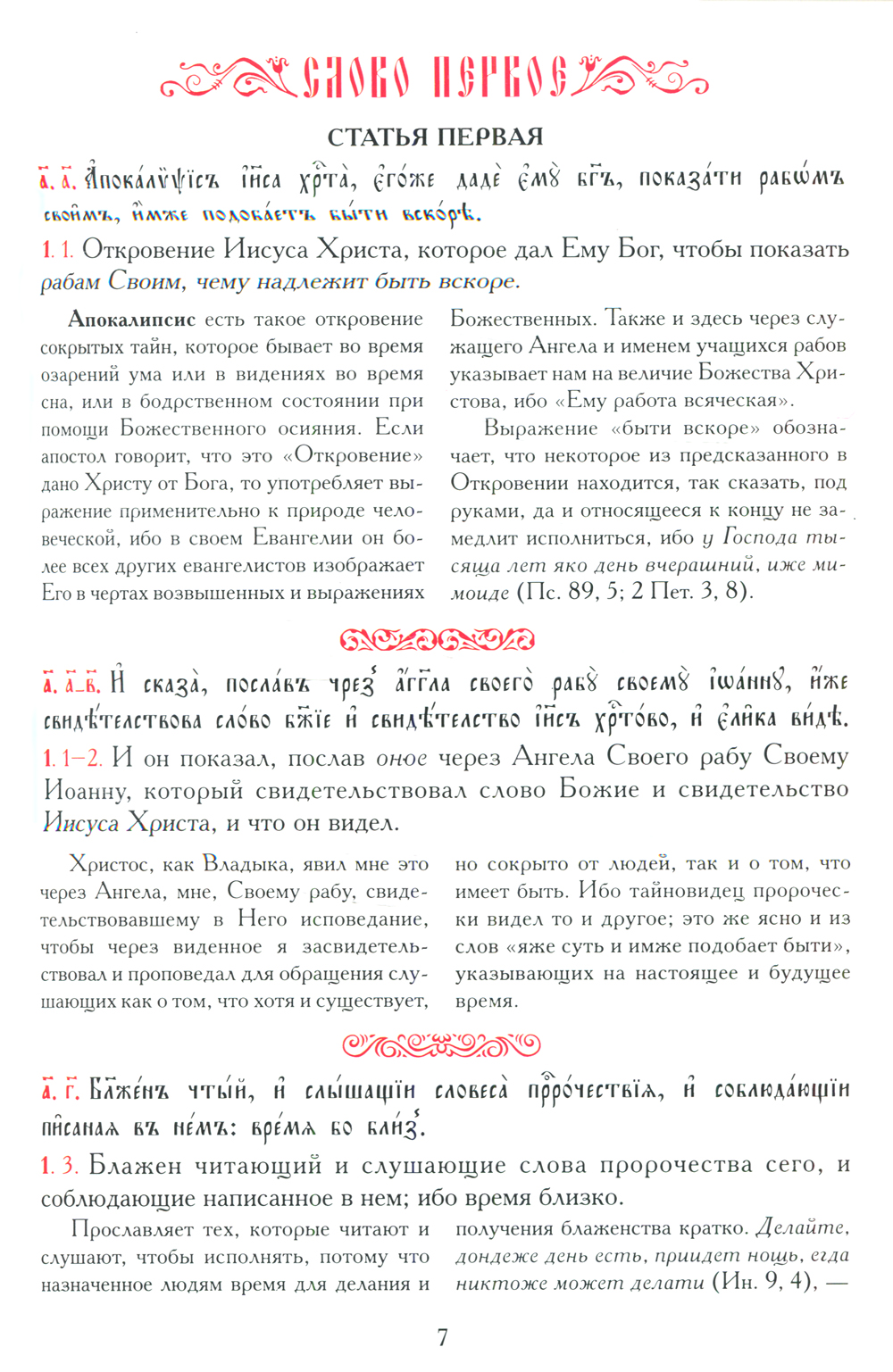 Ныне мир стоит на рубеже второго и третьего тысячелетий Христианской эры, и люди с тревогой вглядываются в будущее. Эта обоснованная тревога мятущихся умов породила множество спекуляций в разных областях человеческих знаний и особенно в религиозной литературе. В последние годы уже не раз являлись и продолжают являться религиозные группы и их вожди, предрекающие «конец света» и объявляющие очередную дату этого события. В этих условиях, желая внести свой вклад в празднование 2000-летия Рождества Христова, полагаем будет полезным обратить внимание читателей на первоисточник апокалипсических ожиданий - книгу Апокалипсис или Откровение святого апостола Иоанна Богослова. Эта священная пророческая книга является последней в числе Новозаветных книг. Цель Откровения - утешить верующих среди гонений и рассеять заботливые опасения насчет будущности Христианства, на которое в то время (конец 1-го века) со всех сторон ополчились враги. Предмет Откровения - брань змия, древнего искусителя, с Агнцем - Искупителем, полная, окончательная победа Агнца и будущее обновление всего мира. Книга заключается следующими словами: «Свидетельствующий сие говорит: ей, гряду скоро! Аминь. Ей, гряди, Господи Иисусе! Благодать Господа нашего Иисуса Христа со всеми вами. Аминь!» Текст Откровения печатается на церковнославянском языке с параллельным русским переводом и толкованием святого Андрея, Архиепископа Кесарийского, которое, несмотря на свою древность (V век), пользуется устойчивым авторитетом в Православной Церкви и заслуженным интересом русских читателей. Текст Апокалипсиса сопровождается иллюстрациями, заимствованными из рукописи XVII века, хранящейся в рукописном отделе Российской Государственной Библиотеки (ф. 173, п. 14).| Издательство | Отчий дом |