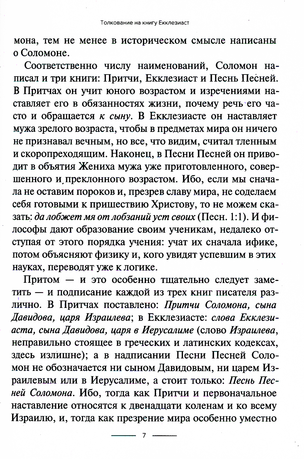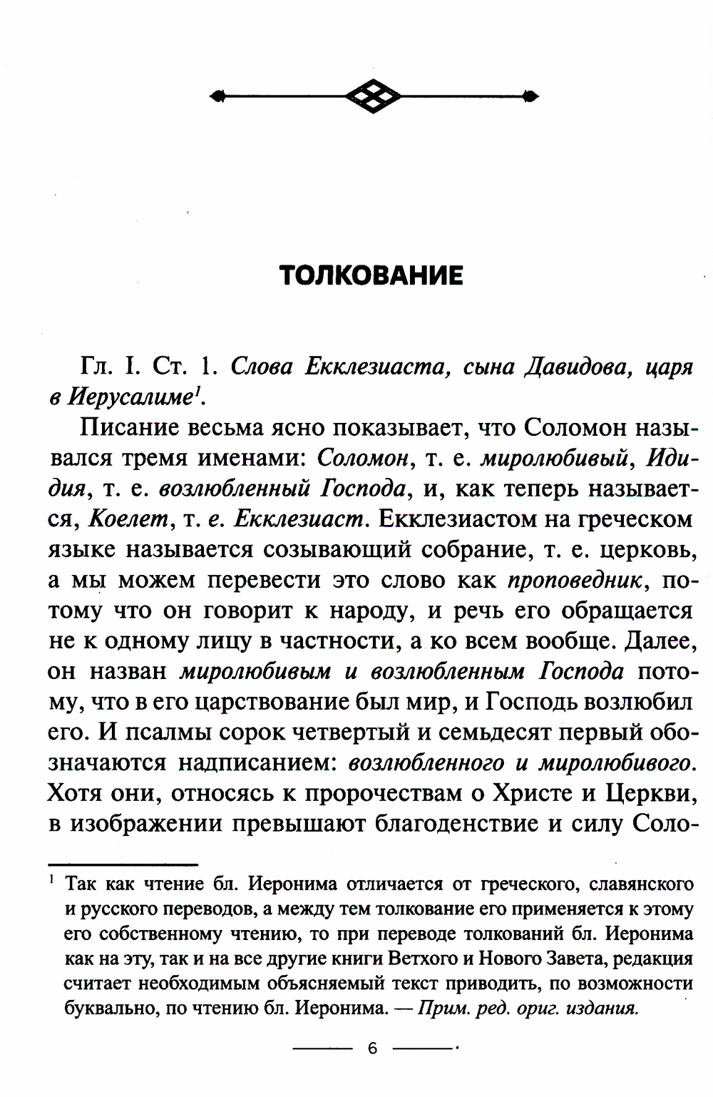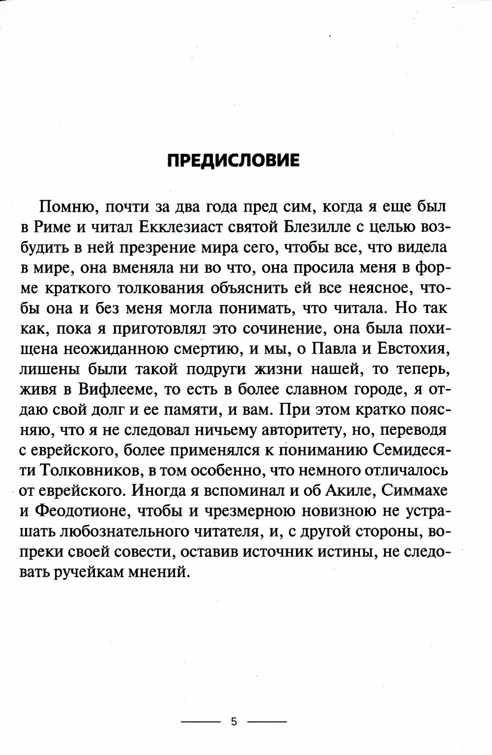 Блаженный Иероним Стридонский (345/347 - 419/420) занимает особое место в ряду христианских церковных писателей: именно ему принадлежит канонический перевод текста Библии на латинский язык. В предлагаемой вашему вниманию книге приведено толкование бл. Иеронима на одну из самых удивительных и оригинальных частей Ветхого Завета - книгу Екклезиаст, создание которой приписывается царю Соломону. Комментарии бл. Иеронима не только помогают читателю осознать глубину философской мысли автора книги Екклезиаст, но и открывают новые грани в постижении смысла существования человека в нашем бренном, но прекрасном мире. Для широкого круга читателей, идущих путём духовного развития и интересующихся историей развития христианской богословской мысли.| Издательство | Амрита-Русь |