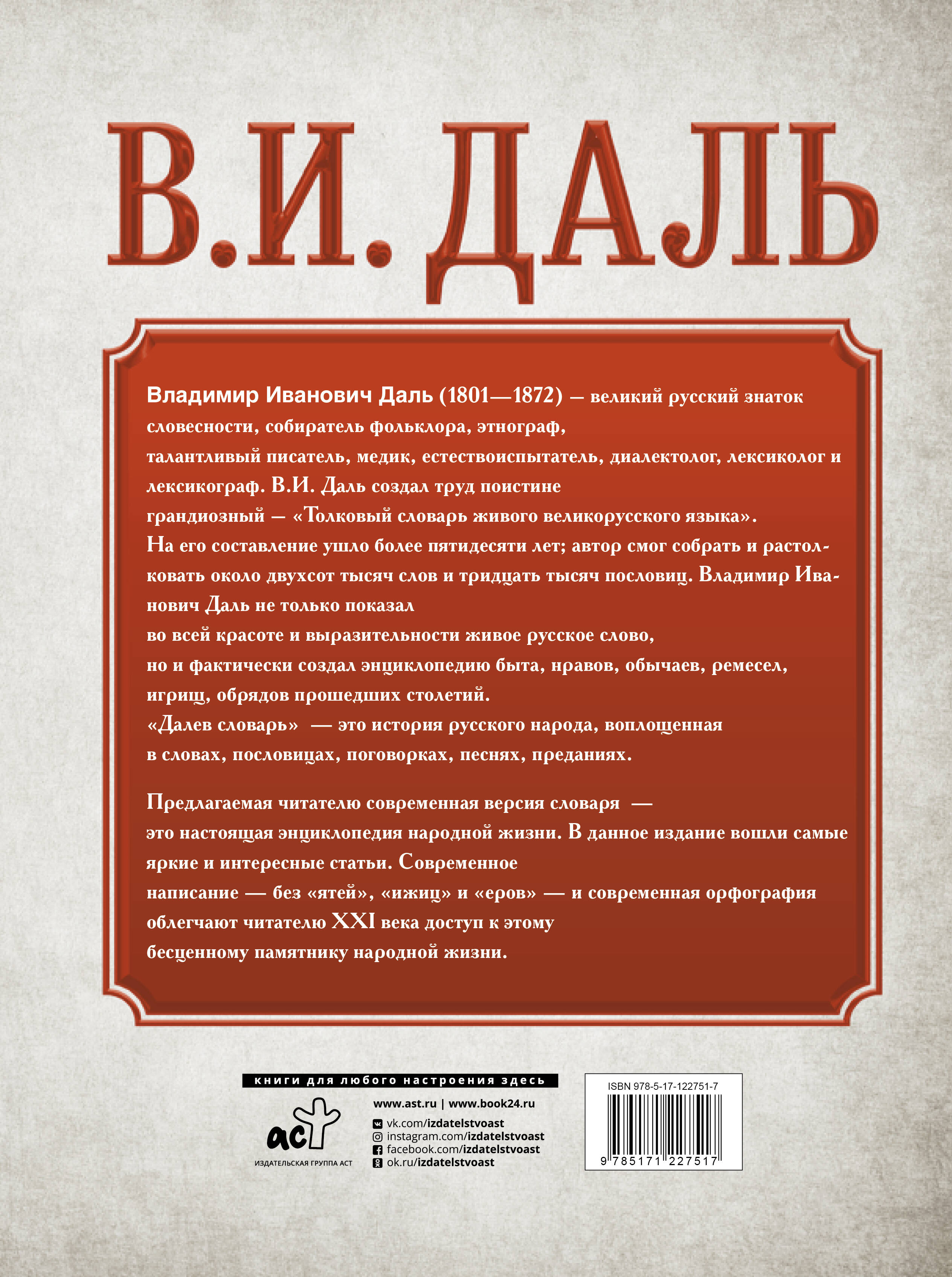 Предлагаемая читателю современная версия "Толкового словаря живого великорусского языка" - это настоящая энциклопедия народной жизни. В данное издание вошли самые яркие и интересные статьи. Современное написание - без "ятей", "ижиц" и "еров" - и современная орфография облегчают читателю XXI века доступ к этому бесценному памятнику народной жизни. Владимир Иванович Даль не только показал во всей красоте и выразительности живое русское слово, но и фактически создал энциклопедию быта, нравов, обычаев, ремесел, игрищ, обрядов прошедших столетий. "Далев словарь" - это история русского народа, воплощенная в словах, пословицах, поговорках, песнях, преданиях.| Издательство | Издательство "АСТ" |