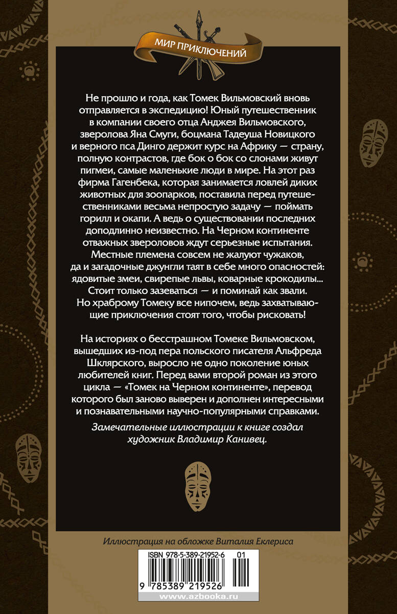 Не прошло и года, как Томек Вильмовский вновь отправляется в экспедицию! Юный путешественник в компании своего отца Анджея Вильмовского, зверолова Яна Смуги, боцмана Тадеуша Новицкого и верного пса Динго держит курс на Африку - страну, полную контрастов, где бок о бок со слонами живут пигмеи, самые маленькие люди в мире. На этот раз фирма Гагенбека, которая занимается ловлей диких животных для зоопарков, поставила перед путешественниками весьма непростую задачу - поймать горилл и окапи. А ведь о существовании последних доподлинно неизвестно. На Черном континенте отважных звероловов ждут серьезные испытания. Местные племена совсем не жалуют чужаков, да и загадочные джунгли таят в себе много опасностей: ядовитые змеи, свирепые львы, коварные крокодилы... Стоит только зазеваться - и поминай как звали. Но храброму Томеку все нипочем, ведь захватывающие приключения стоят того, чтобы рисковать! На историях о бесстрашном Томеке Вильмовском, вышедших из-под пера польского писателя Альфреда Шклярского, выросло не одно поколение юных любителей книг. Перед вами второй роман из этого цикла - "Томек на Черном континенте", перевод которого был заново выверен и дополнен интересными и познавательными научно-популярными справками. Замечательные иллюстрации к книге создал художник Владимир Канивец.| Издательство | Азбука-Аттикус Издат.группа ООО |