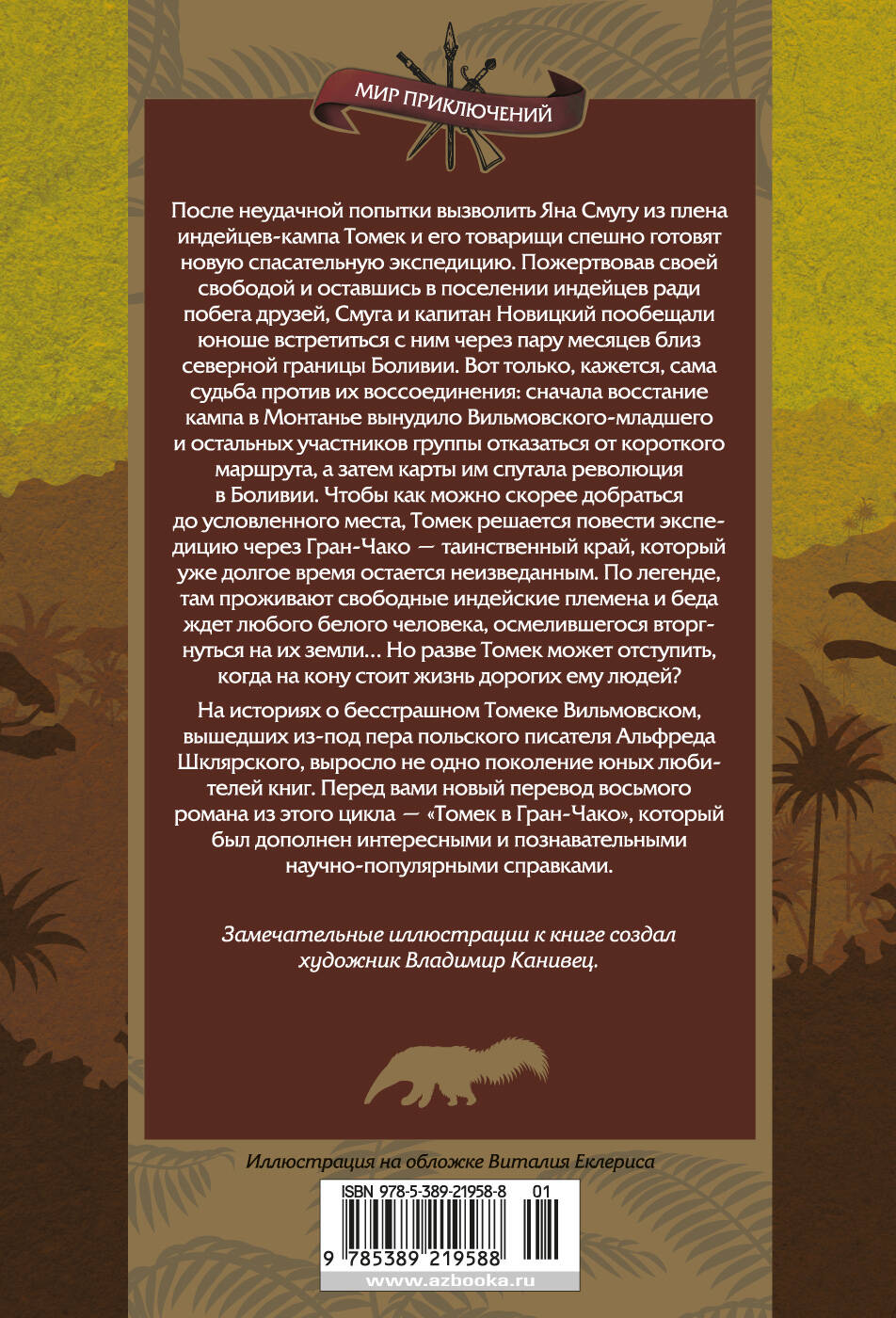 После неудачной попытки вызволить Яна Смугу из плена индейцев кампа Томек и его товарищи спешно готовят новую спасательную экспедицию. Пожертвовав своей свободой и оставшись в поселении индейцев ради побега друзей, Смуга и капитан Новицкий пообещали юноше встретиться с ним через пару месяцев близ северной границы Боливии. Вот только, кажется, сама судьба против их воссоединения: сначала восстание кампа в Монтанье вынудило Вильмовского-младшего и остальных участников группы отказаться от короткого маршрута, а затем карты им спутала революция в Боливии.. Чтобы как можно скорее добраться до условленного места, Томек решается повести экспедицию через Гран-Чако - таинственный край, который уже долгое время остается неизведанным. По легенде там проживают свободные индейские племена и беда ждет любого белого человека, осмелившегося вторгнуться на их земли… Но разве Томек может отступить, когда на кону стоят жизни дорогих ему людей? На историях о бесстрашном Томеке Вильмовском, вышедших из-под пера польского писателя Альфреда Шклярского, выросло не одно поколение юных любителей книг. Перед вами новый перевод восьмого романа из этого цикла - "Томек в Гран-Чако", который был дополнен интересными и познавательными научно-популярными справками. Замечательные иллюстрации к книге создал художник Владимир Канивец.| Издательство | Азбука-Аттикус Издат.группа ООО |